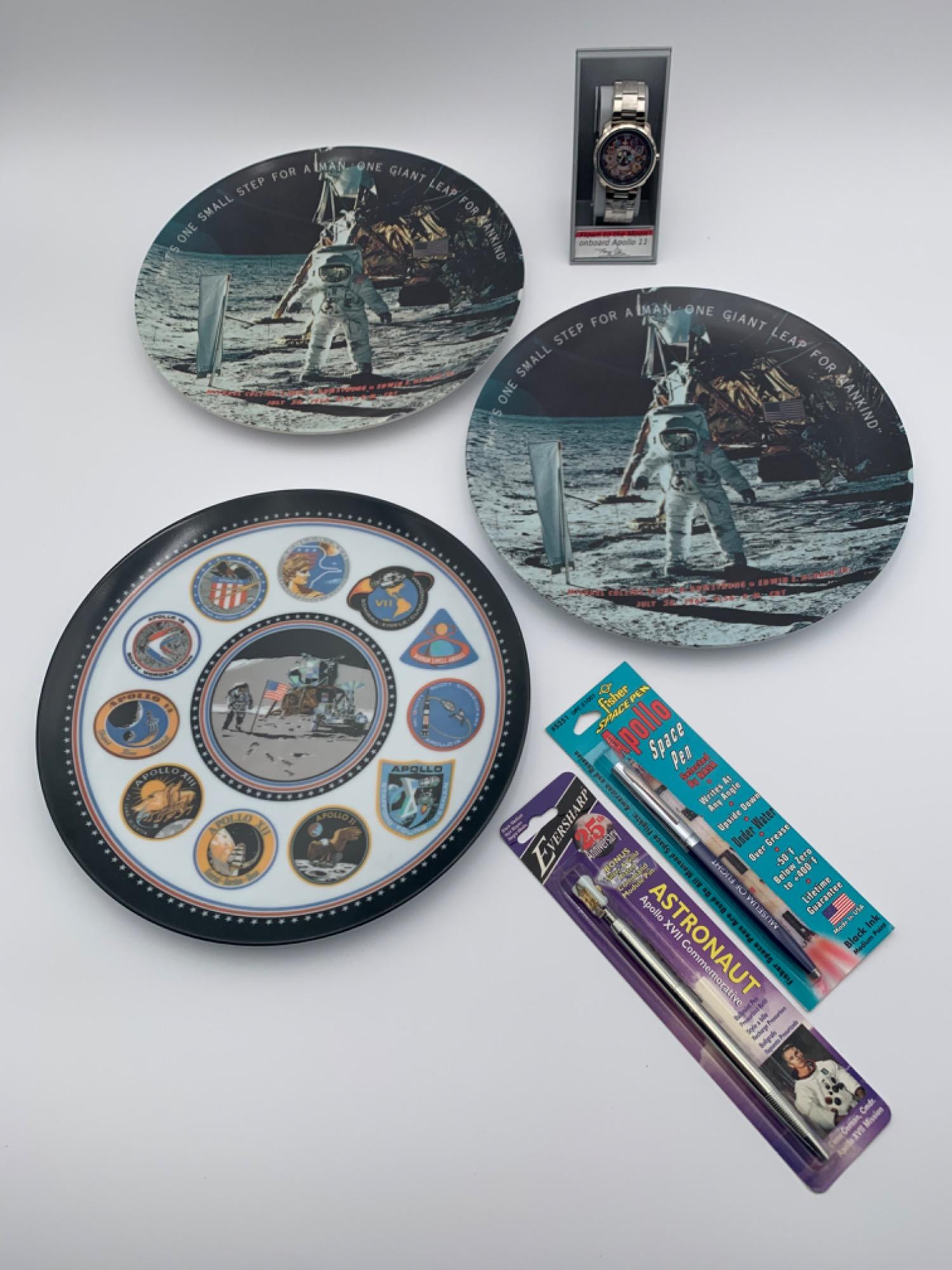 Lot # 92 - Astronaut Souvenirs - Pens, Plates & Watch Starting Bid: $ 5.00 Bids: This sale will end in: |