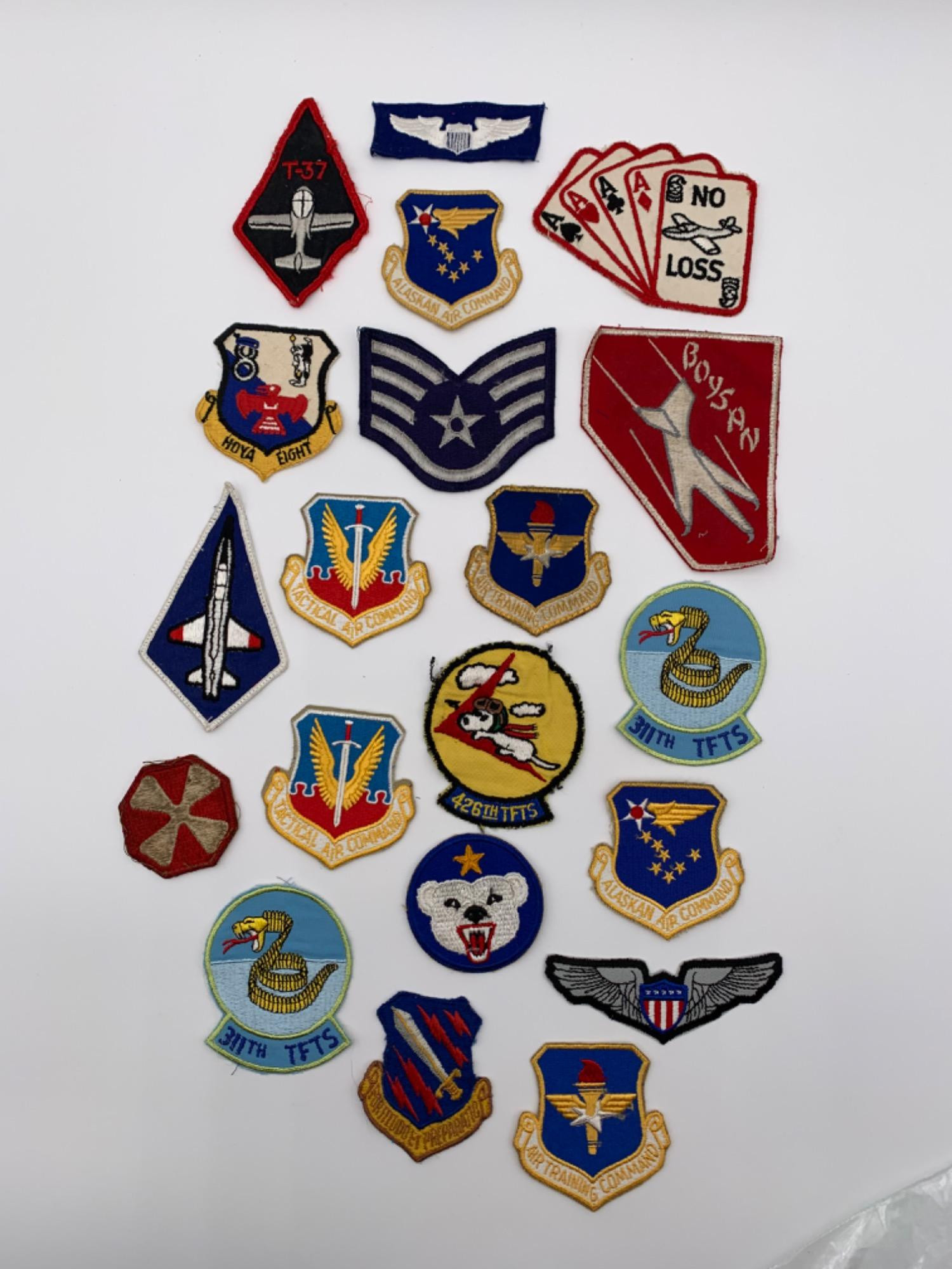 AUTHENTIC ITEMS INVOLVED IN SPACE EXPLORATION/MILITARY SERVICE: Piece of the Liberty Bell 7 capsule, USAF flight suit, & many logo patches