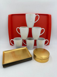 Lot # 169 - Vintage Ikea Sue Pryke Mugs + Mid Century Gold & Orange Trays Starting Bid: $ 5.00 Bids: This sale will end in: |