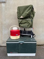 Lot # 159 - Vintage Green Coleman Cooler - NOS Contender Hiking Backpack + Starting Bid: $ 5.00 Bids: This sale will end in: |