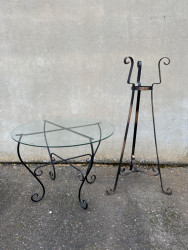 Lot # 178 - Mid Century Wrought Iron Plant Stand + Metal Scroll & Glass Table Starting Bid: $ 5.00 Bids: This sale will end in: |