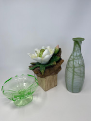 1944 Roseville Clematis Basket Bowl & 1940s Freesia Vases. Sterling Shakers - Weighted 116 Grams. Mid Century Kay Finch Sea Shells & Pottery Pieces. Signed Colin Cunningham 2005 Totem Oar On Burl Wood Stand