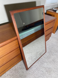 Glostrup Møbelfabrik Mid-Century Teak Table and Chairs, Danish Mid-Century Teak Glass Front Cabinet. Tørring Danish Modern Six Drawer Dresser, Mirror, Gentleman’s Chest, Arenkiel King Bed Set