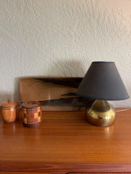 Lot # 76 - Signed Pottery Tray, Wood Coasters and Brass Lamp Starting Bid: $ 5.00 Bids: This sale will end in: |