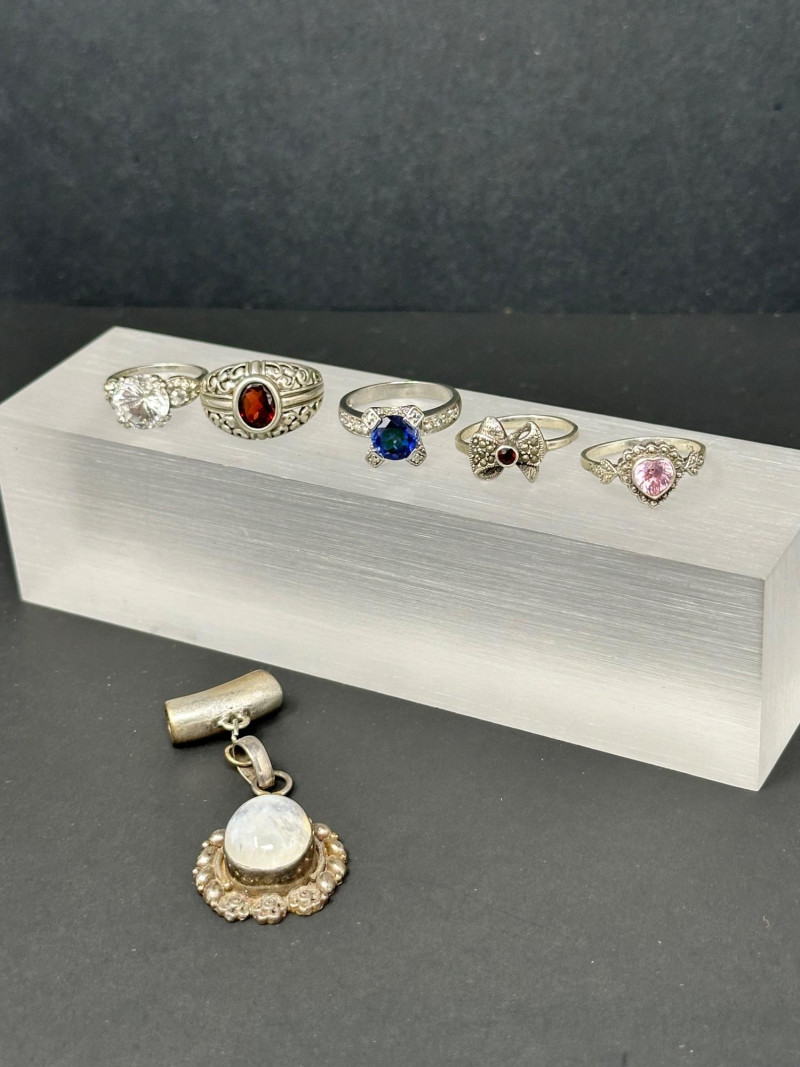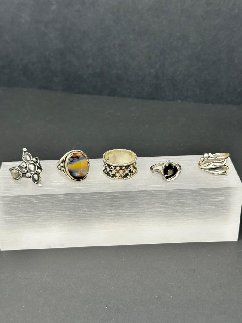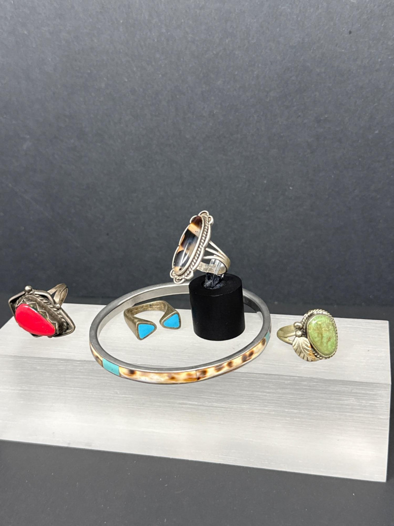 Lot # 21 - Sterling & Stone Jewelry Assortment — 4 Rings & 1 Bangle Starting Bid: $ 5.00 Bids: Bidding starts in: |