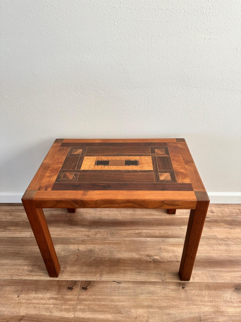 Lot # 7 - Solid Wood Geometric Marquetry Inlay Table with Dual Panel Design Starting Bid: $ 5.00 Bids: Bidding starts in: |