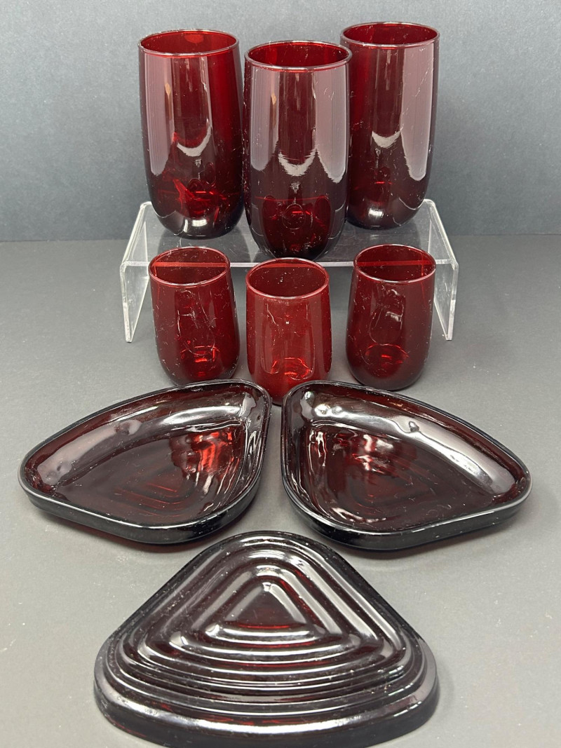 Lot # 59 - Vintage Ruby Red Glass Tableware Set – Likely Anchor Hocking Starting Bid: $ 5.00 Bids: Bidding starts in: |