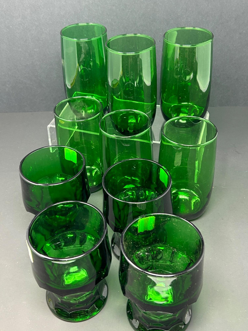 Lot # 28 - Vintage Green Glass Drinking Glass Set – Mixed Tumblers & Tall Glasses Starting Bid: $ 5.00 Bids: Bidding starts in: |