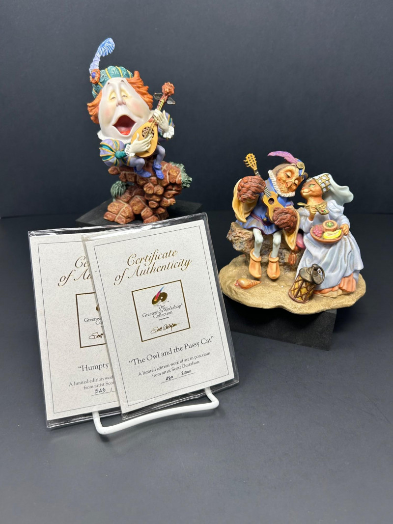 Scott Gustafson Figurines with COA – Limited edition porcelain works featuring whimsical characters like Humpty Dumpty and Owl & Pussy Cat.
