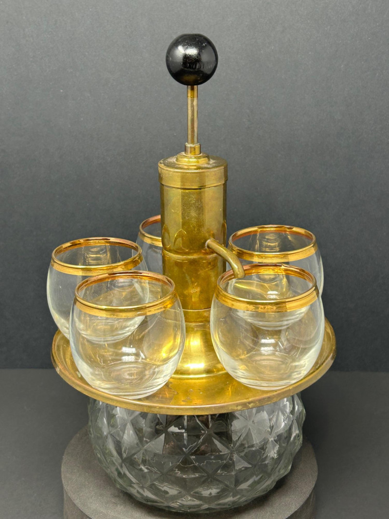 Lot # 99 - MCM Park Sherman Pump Liquor Dispenser Set with Brass Tray & Glasses Starting Bid: $ 5.00 Bids: Bidding starts in: |