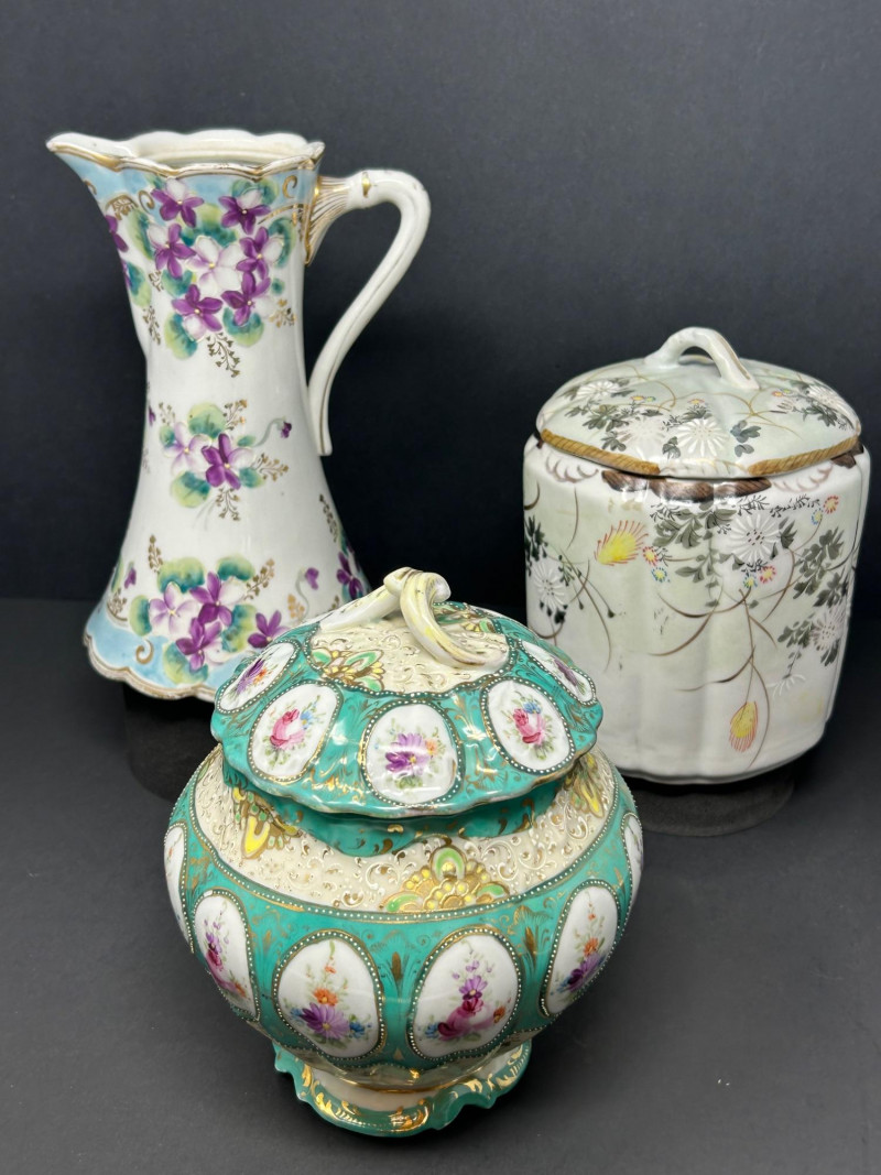 Lot # 114 - Vintage European Porcelain Pitcher and Biscuit Jars Starting Bid: $ 5.00 Bids: Bidding starts in: |