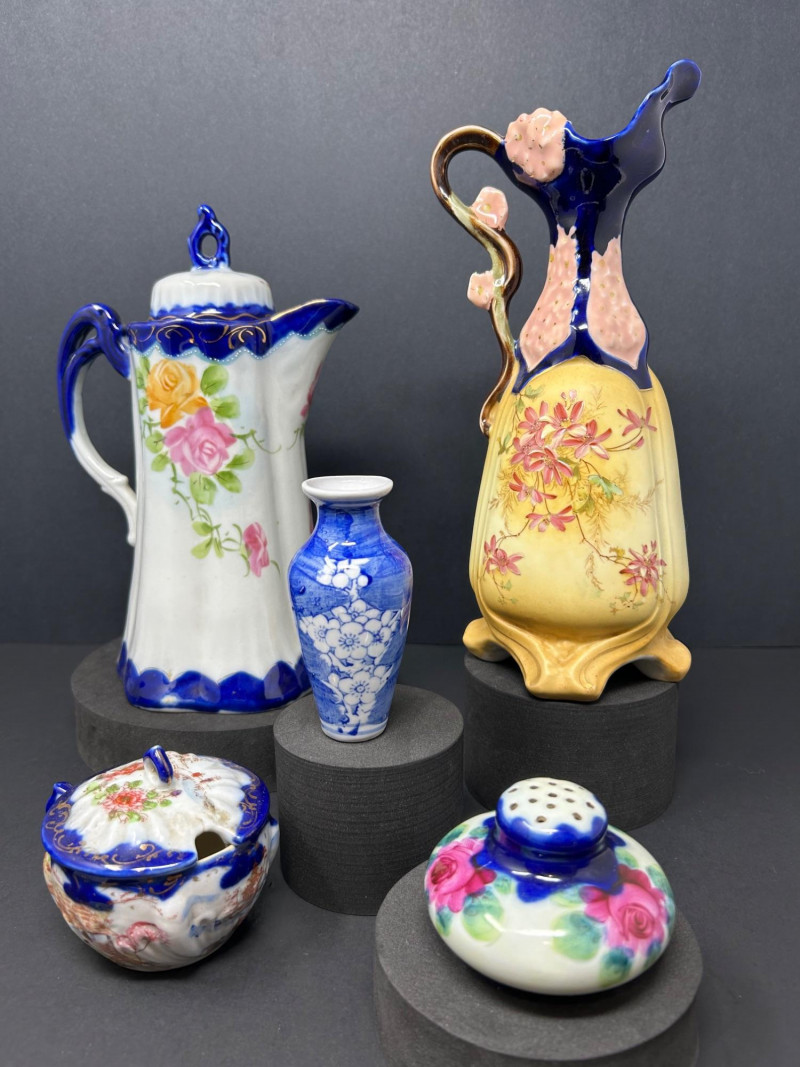 Lot # 115 - Vintage Floral Porcelain Lot – Blue Chocolate Pot, Pitcher & More Starting Bid: $ 5.00 Bids: Bidding starts in: |