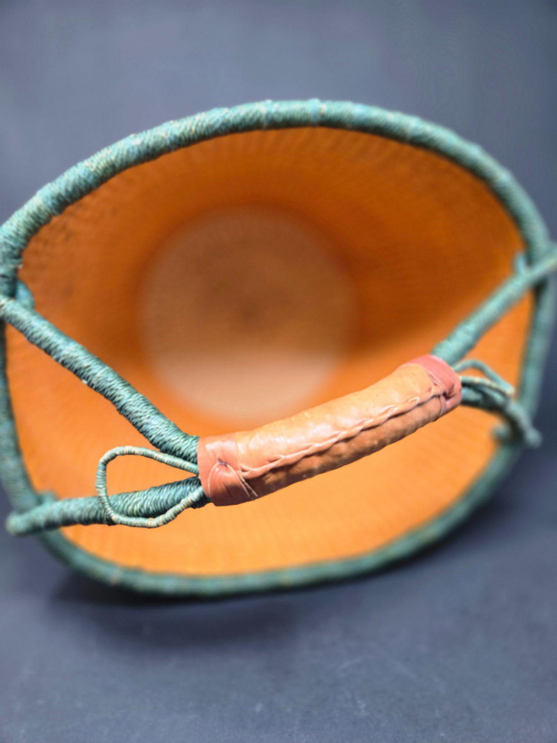 Lot # 93 - Handwoven African Bolga Market Basket w/Leather Wrapped Handle Starting Bid: $ 5.00 Bids: Bidding starts in: |