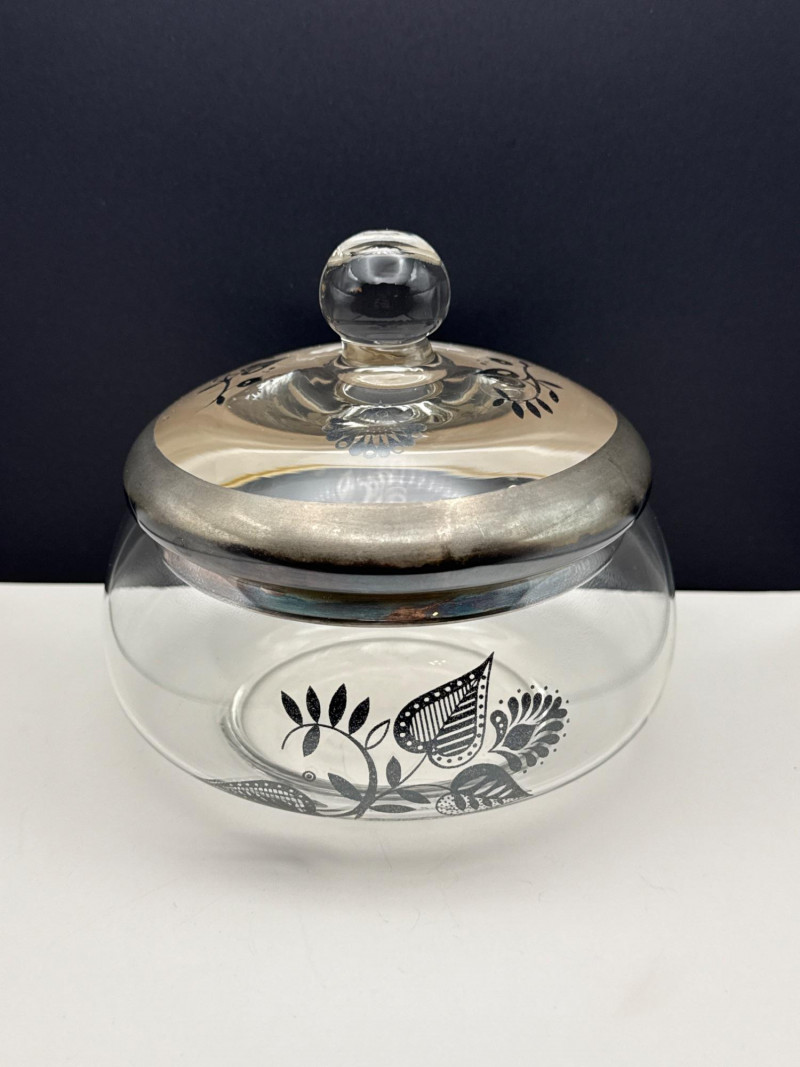 Lot # 22 - MCM Georges Briard Silver Damask Lidded Glass Candy Jar Starting Bid: $ 5.00 Bids: Bidding starts in: |