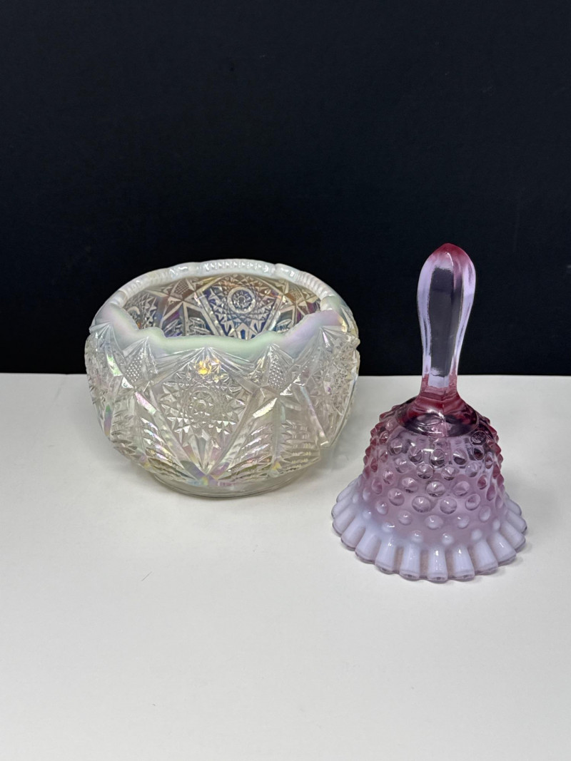 Lot # 86 - Fenton Hobnail Bell & Opalescent Rose Bowl Starting Bid: $ 5.00 Bids: Bidding starts in: |