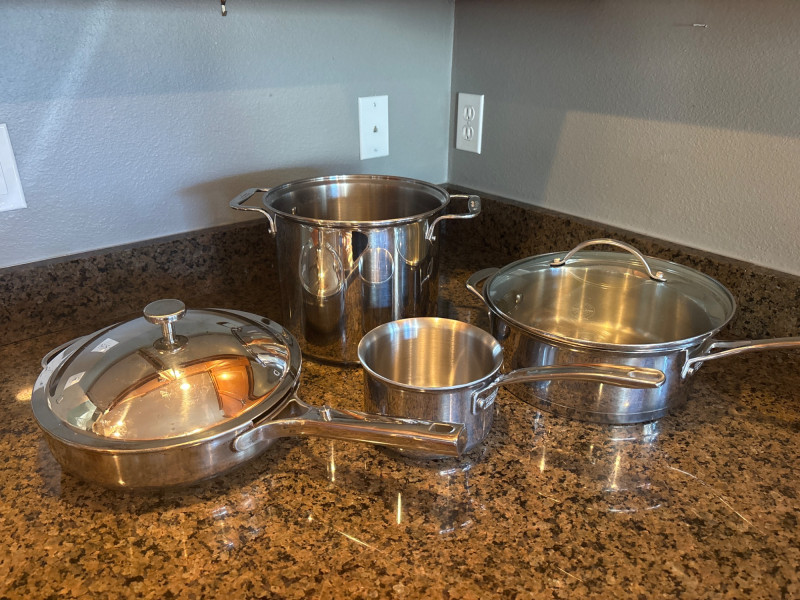 Lot # 154 - Pots & Pans- incl. ALL CLAD Stockpot Starting Bid: $ 5.00 Bids: Bidding starts in: |