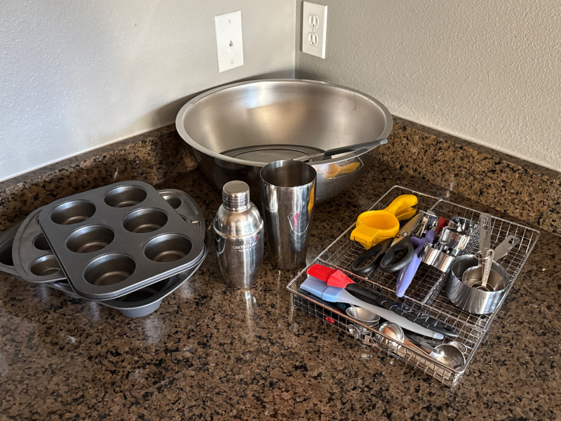Lot # 152 - Kitchen Accessories- Large Mixing Bowl, Utensils, Muffin Pans + Starting Bid: $ 5.00 Bids: Bidding starts in: |