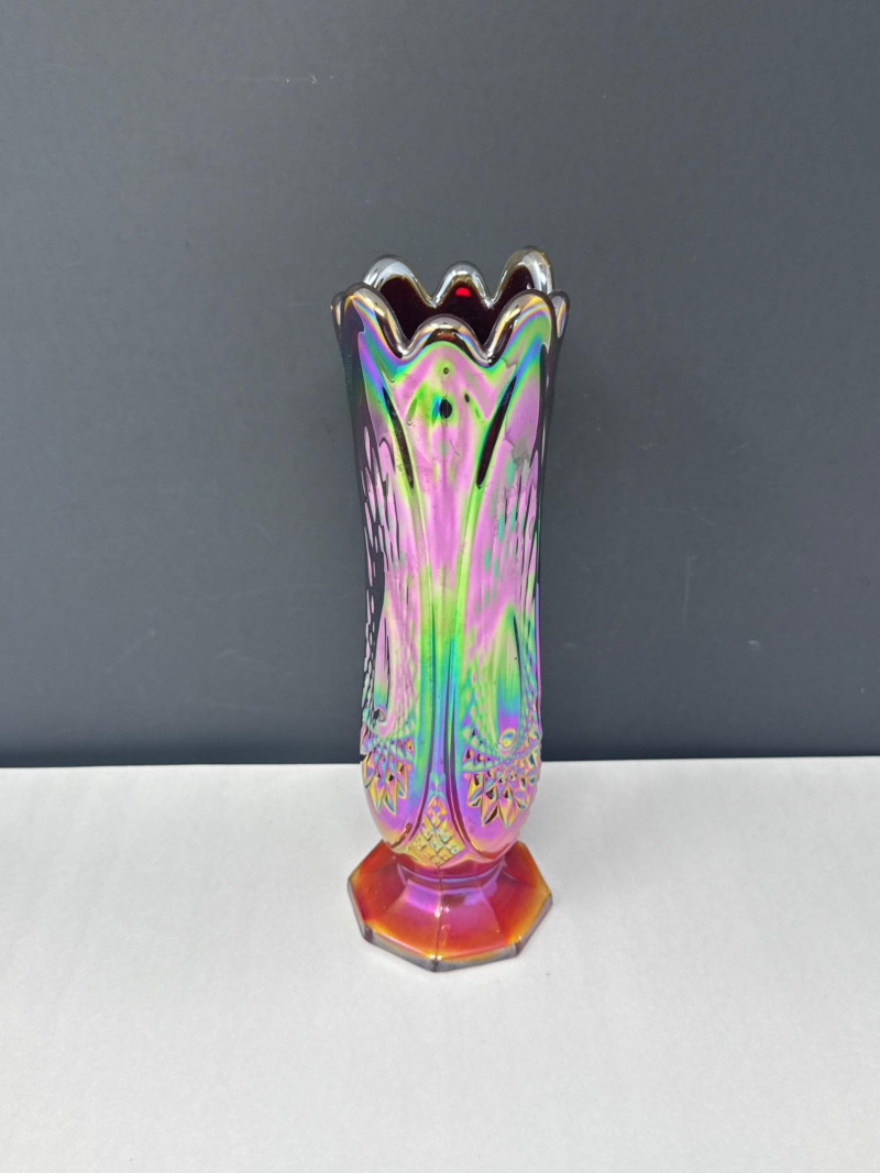 Lot # 38 - MCM Iridescent Carnival Glass Swung Vase Starting Bid: $ 5.00 Bids: Bidding starts in: |