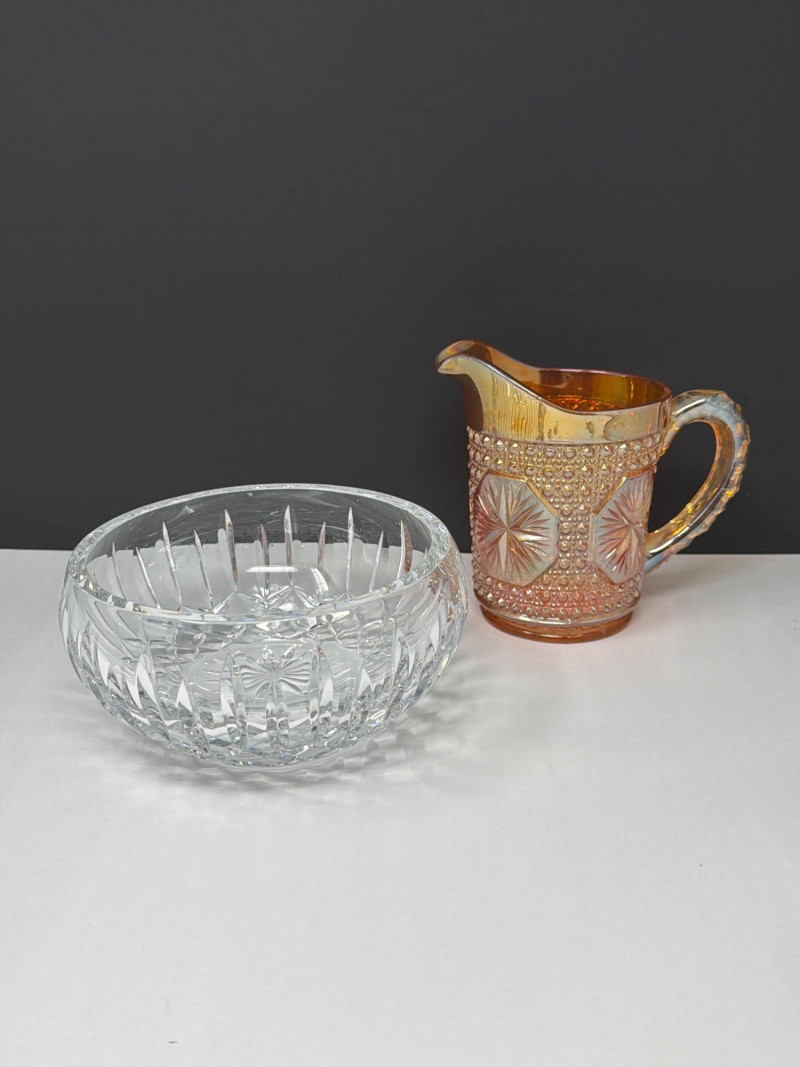 Lot # 77 - Cut Crystal Bowl & Imperial Glass Carnival Pitcher Starting Bid: $ 5.00 Bids: Bidding starts in: |