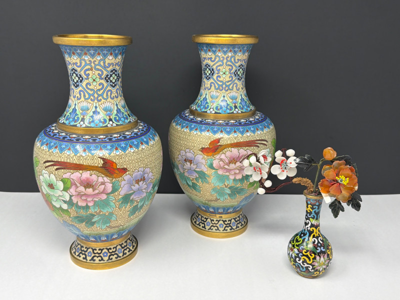 Lot # 47 - Vintage Cloisonné Vase Pair w/ Smaller Vase & Jade Flowers Starting Bid: $ 5.00 Bids: Bidding starts in: |