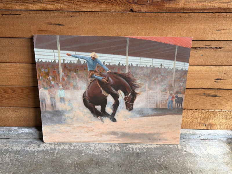 Lot # 93 - Vintage 1971 “Saddle Bronc” Rodeo Painting by Bonita Green Starting Bid: $ 5.00 Bids: Bidding starts in: |