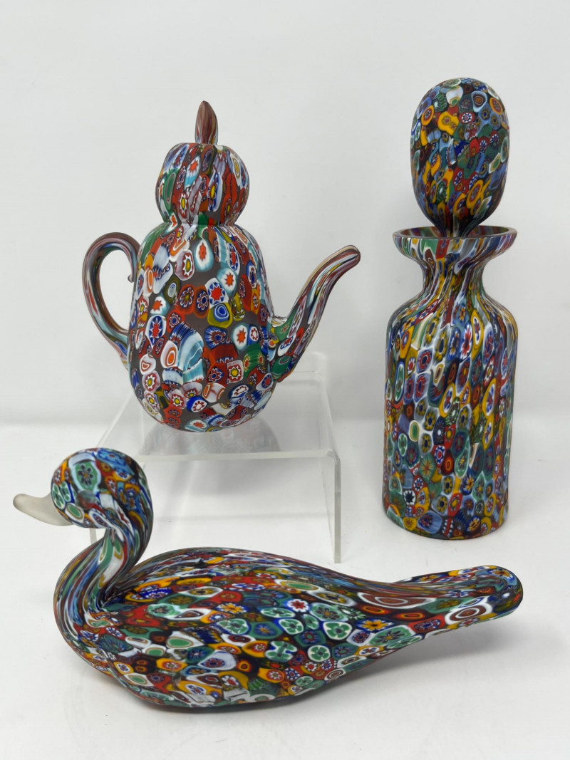 Lot # 102 - Murano Millefiori Trio – Teapot, Stoppered Bottle & Duck Figurine