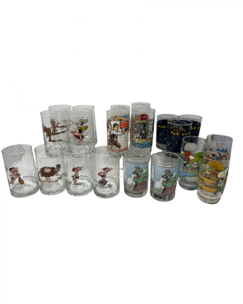 A vibrant and nostalgia-packed 20-piece collection of vintage promotional drinking glasses featuring beloved characters from fast food campaigns and pop culture icons of the 1970s–1980s. This lot includes Flintstones favorites like Fred and Dino, Pac-Man arcade graphics, Looney Tunes classics, and futuristic flair from The Jetsons, plus rare tie-ins like Indiana Jones. Each glass showcases colorful wraparound artwork and classic branding, making this set ideal for collectors, retro decorators, or resale. The Flintstones – Multiple glasses featuring Fred Flintstone and Dino Pac-Man – Arcade-style graphics with ghosts and maze elements Looney Tunes – Characters like Yosemite Sam The Jetsons – Futuristic family scene Indiana Jones – Adventure-themed glass Additional character glasses from 1970s–1980s fast food promotionsescription