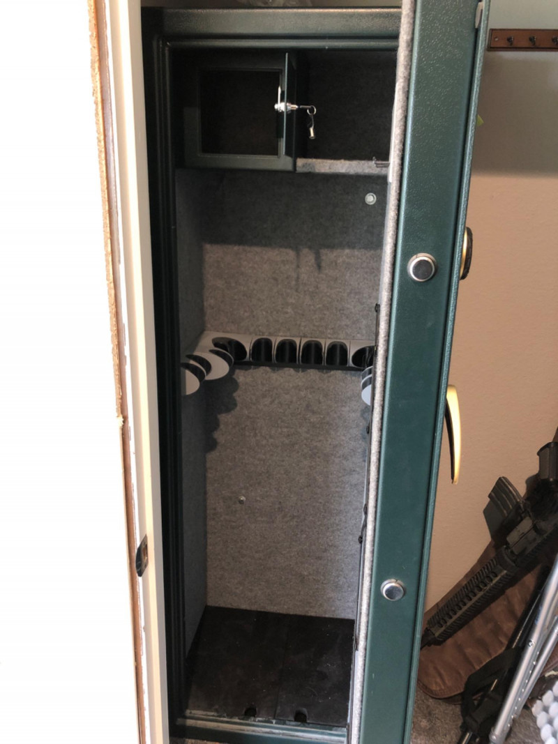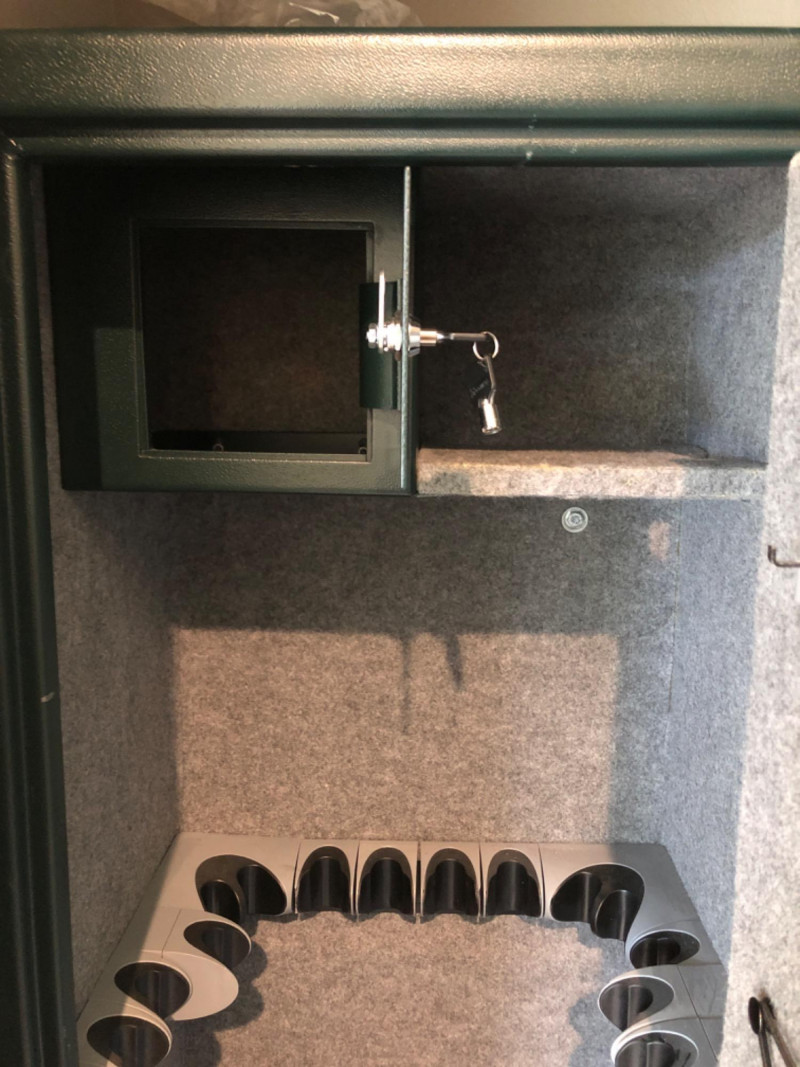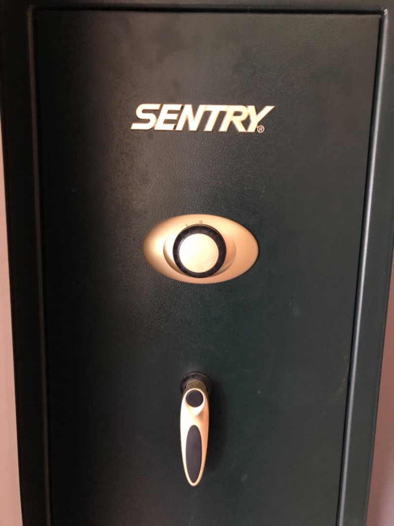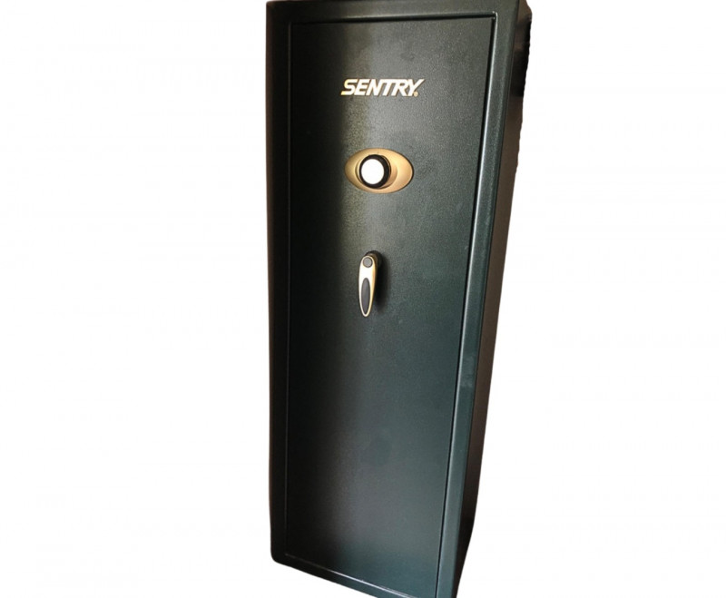 Sentry Safe personal security safe, ideal for safeguarding documents, valuables, and digital media. Features include fire-resistant construction, key or combination lock (model-specific), and compact design suitable for home or office use. Durable steel housing with interior storage tray and 12 rifle capacity. Model G7211.