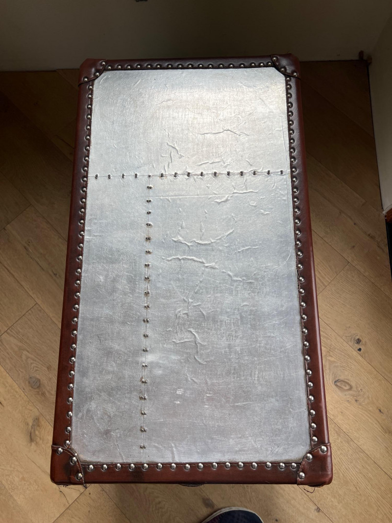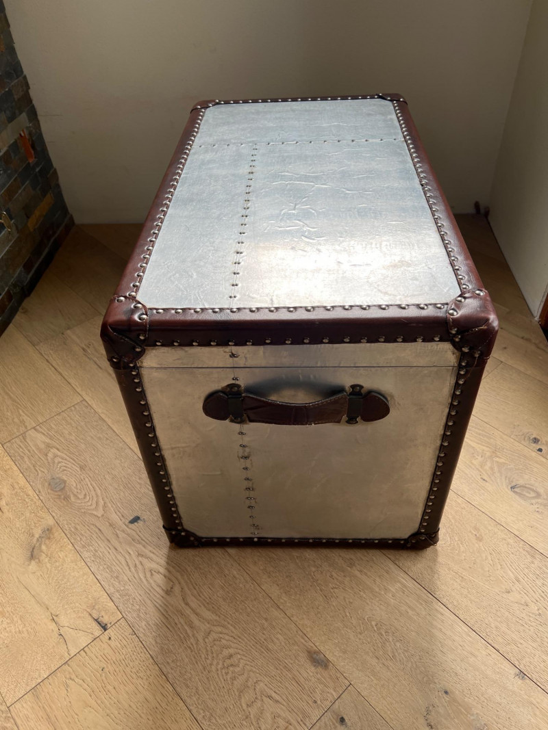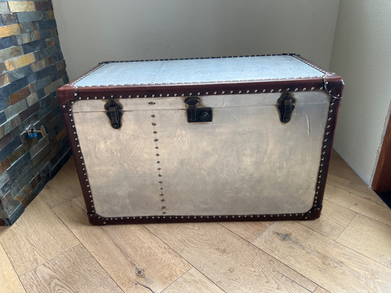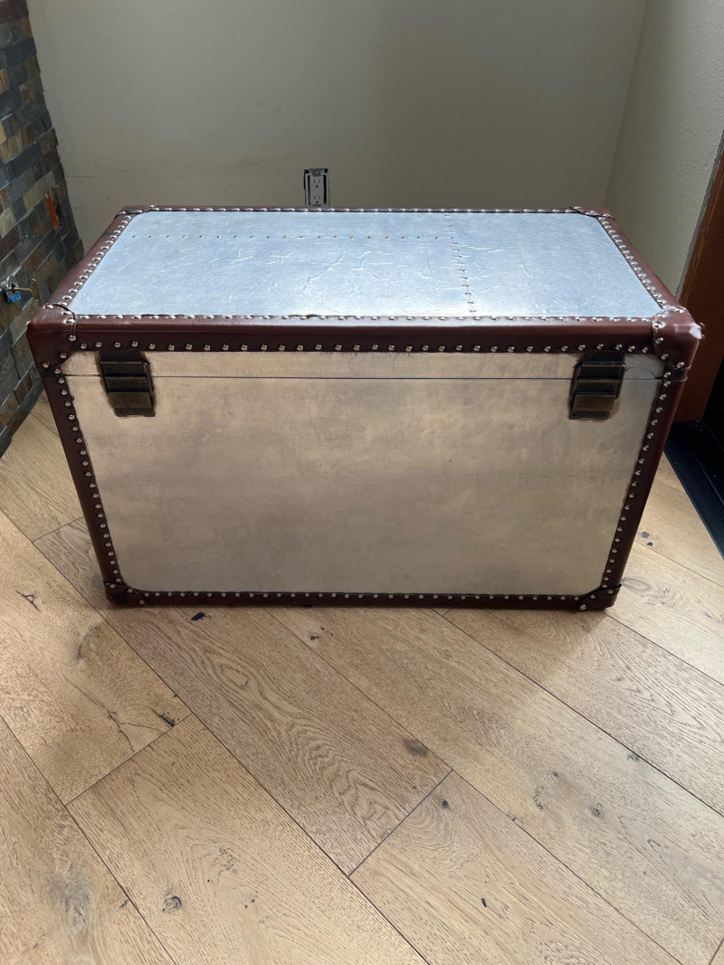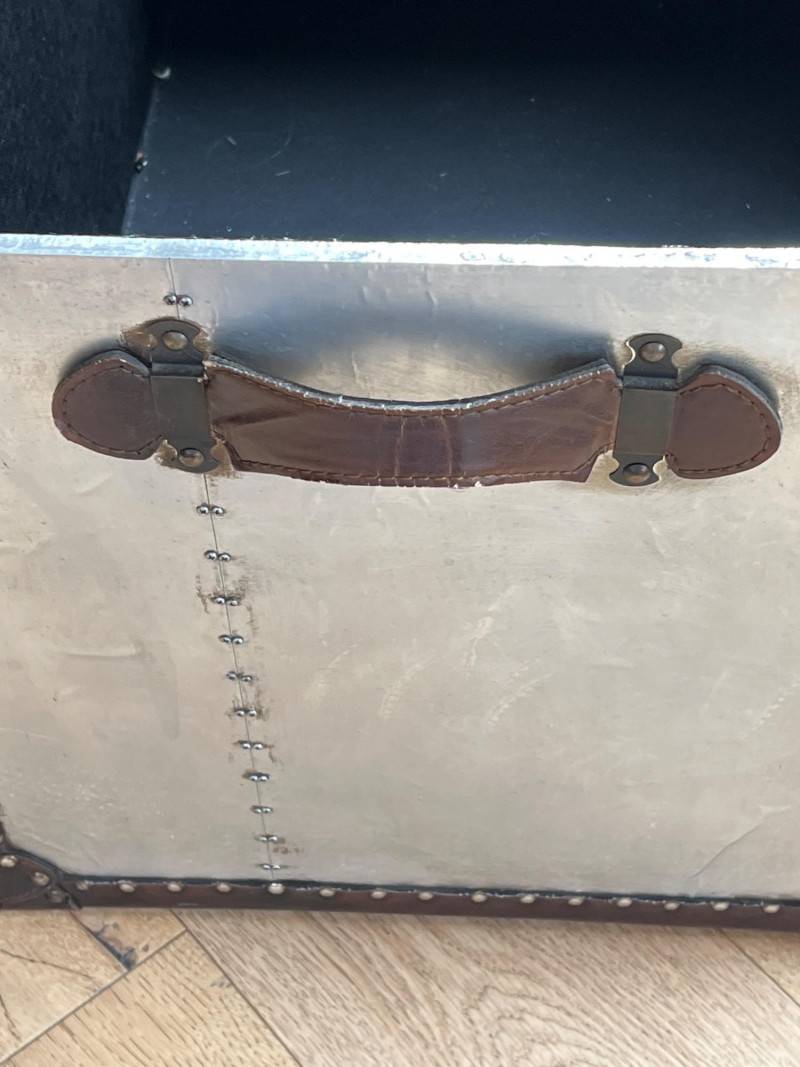 A Restoration Hardware-inspired coffee table with trunk-style storage and industrial charm. This compact piece features a weathered finish and functional interior space, perfect for storing blankets, books, or keepsakes. Ideal for lofts, dens, or curated living rooms. Studded leather detail and handles.