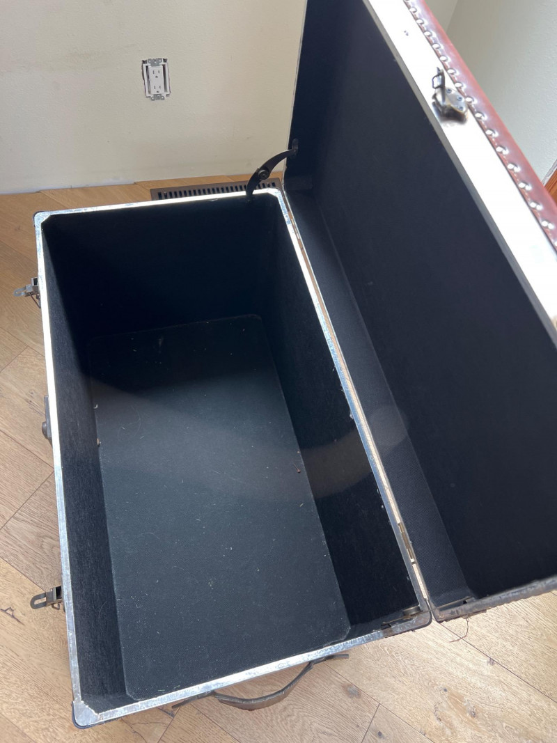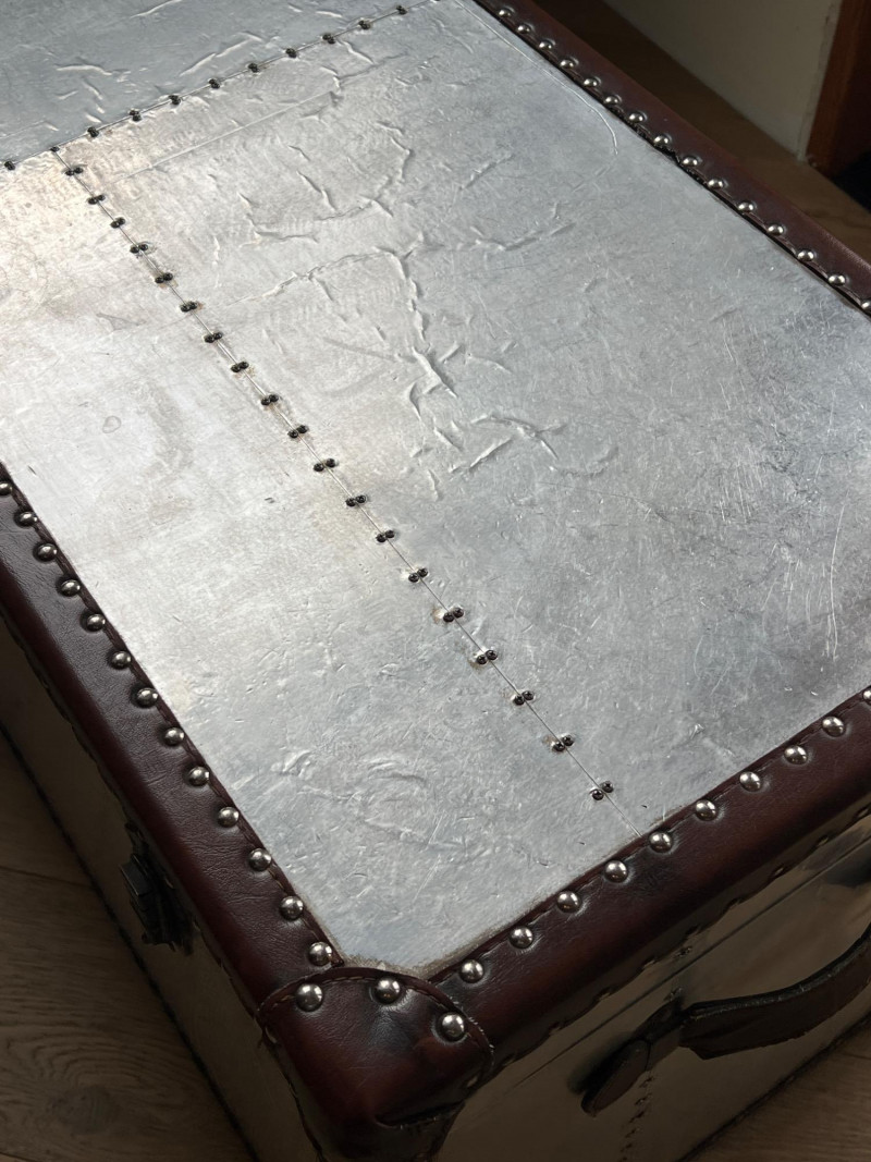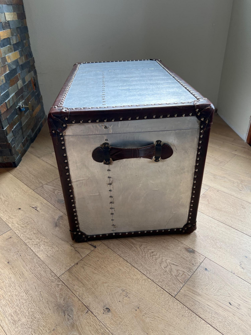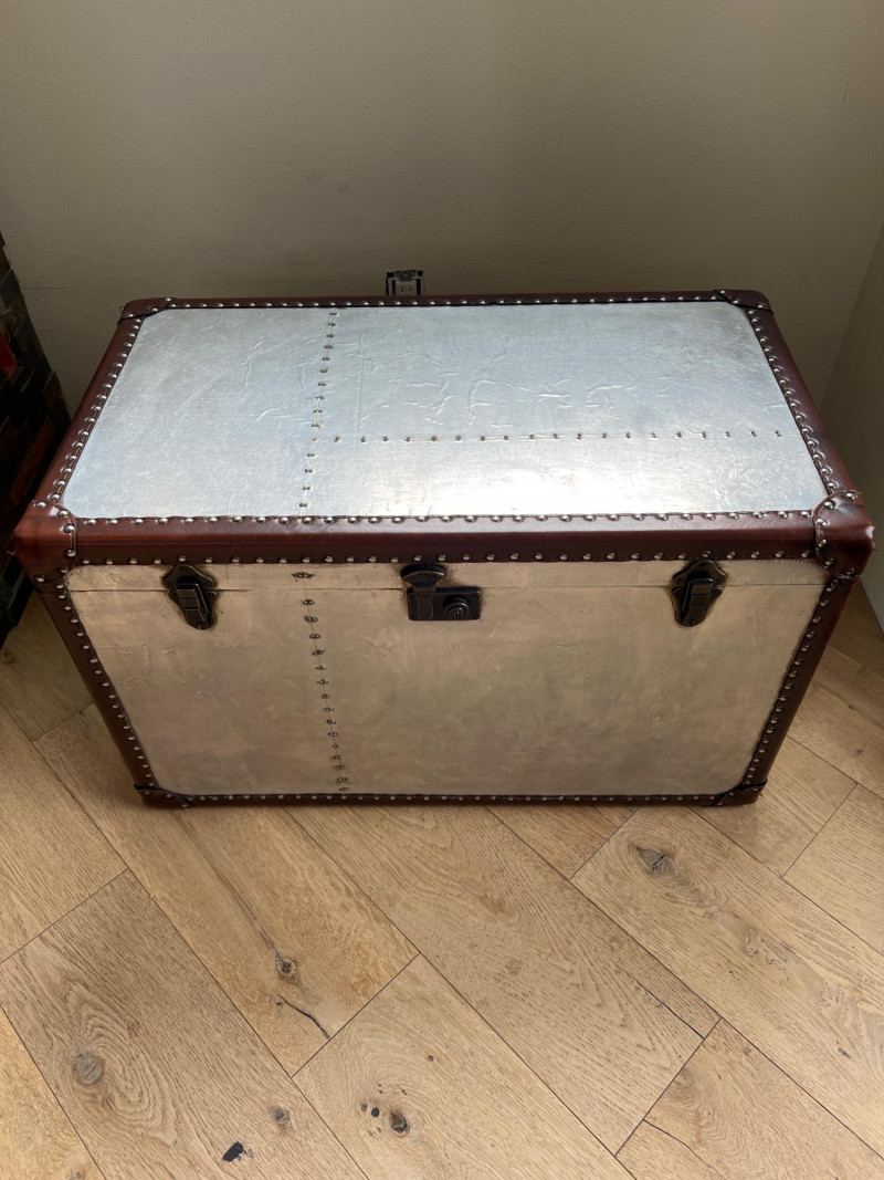 A Restoration Hardware-inspired coffee table with trunk-style storage and industrial charm. This compact piece features a weathered finish and functional interior space, perfect for storing blankets, books, or keepsakes. Ideal for lofts, dens, or curated living rooms. Studded leather detail and handles.