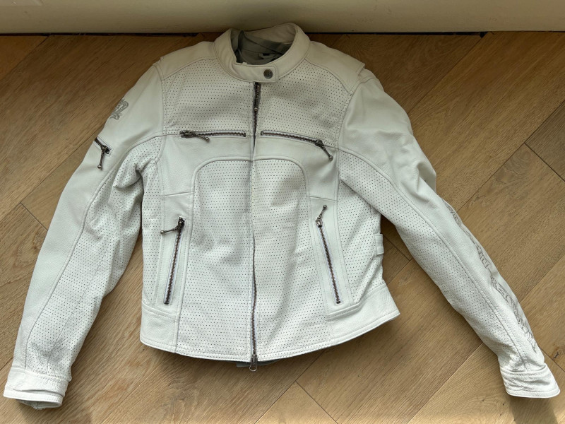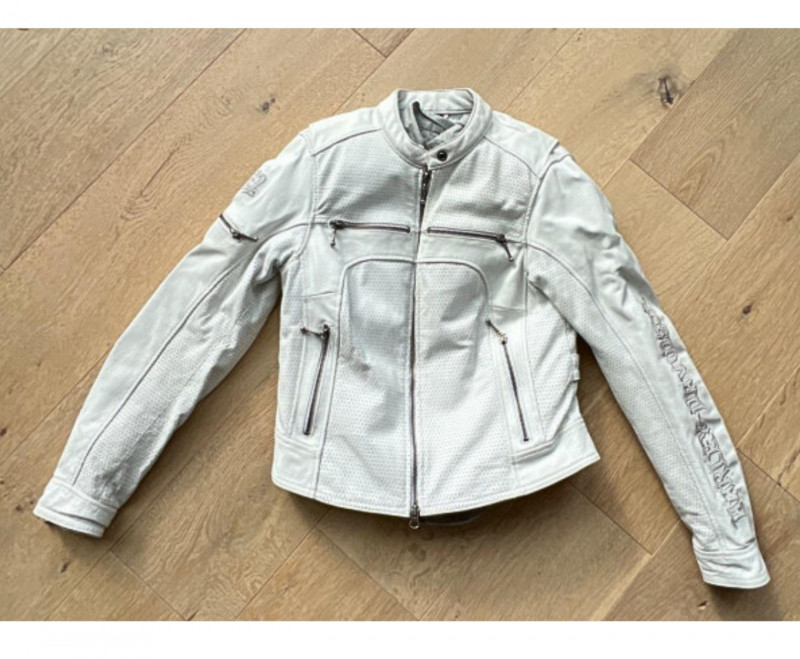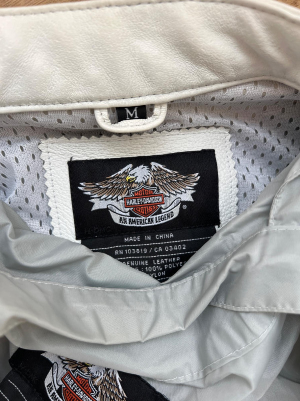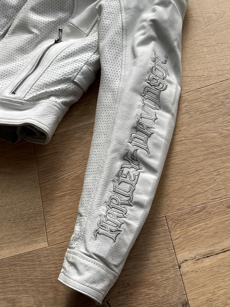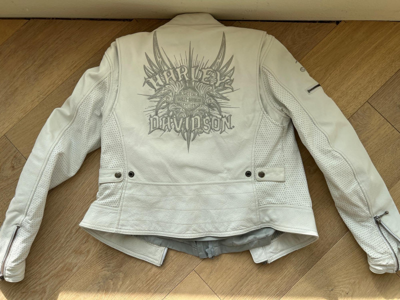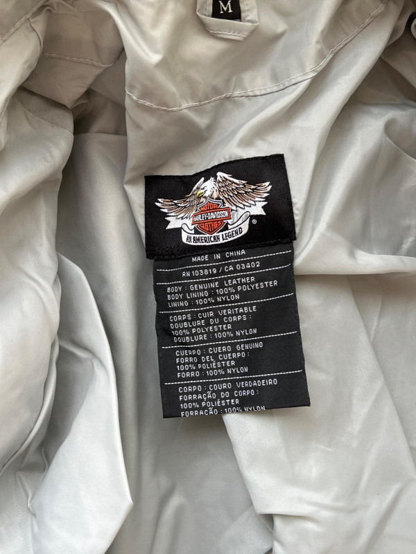 A striking Harley-Davidson women’s jacket in genuine white leather, featuring a removable inner nylon liner for added comfort and versatility. Designed with classic biker styling and premium materials, this piece blends iconic branding with functional warmth. Ideal for collectors, riders, or fashion-forward enthusiasts. Material: Genuine leather with nylon liner Color: White Style: Women’s motorcycle jacket