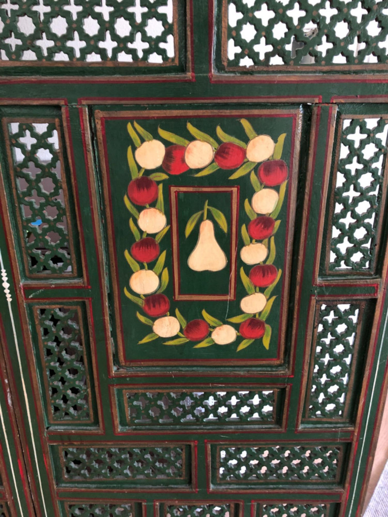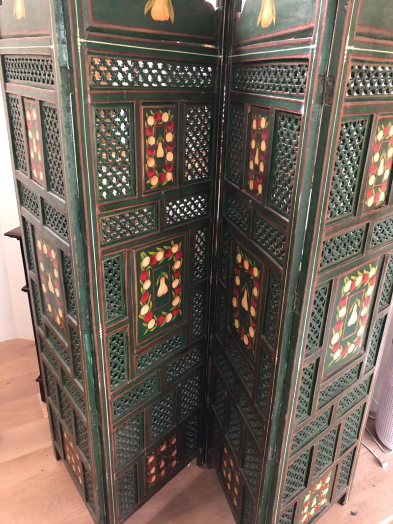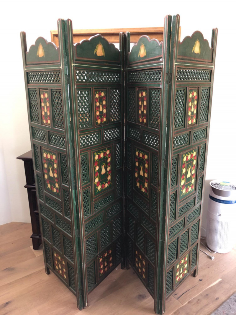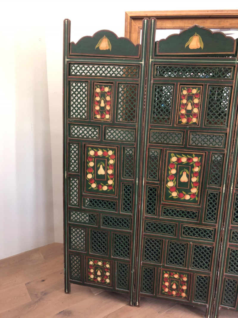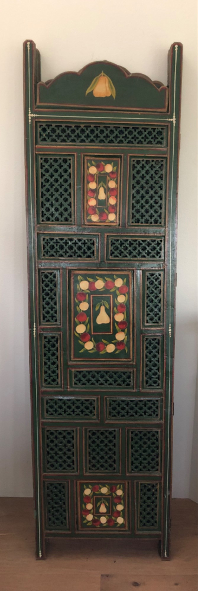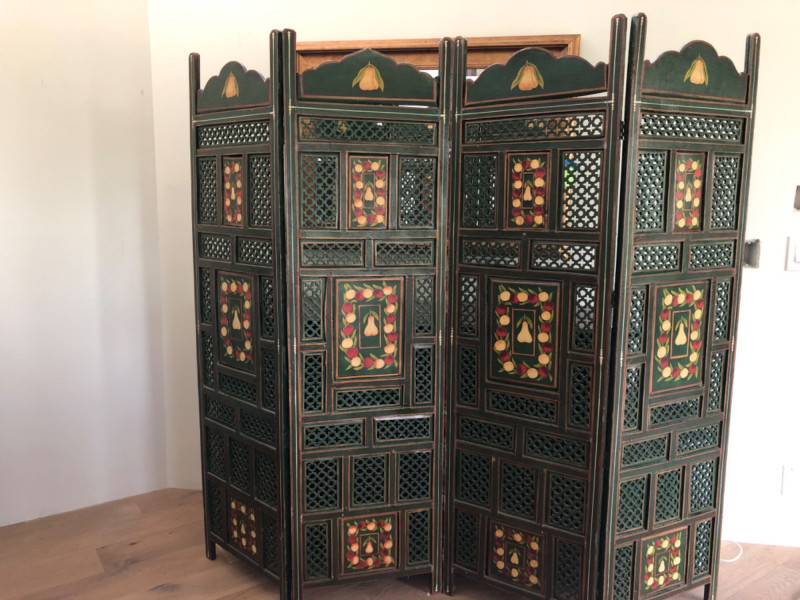 Add warmth and whimsy to any space with this hand-painted wooden room divider, featuring a charming fruit motif across its panels. Measuring 80 inches in length and 72 inches in height, this substantial piece offers both visual impact and practical function—ideal for defining spaces or serving as a decorative backdrop. The artwork evokes a rustic, farmhouse feel with painterly detail and vibrant tones. Material: Solid wood Design: Hand-painted fruit motif Dimensions: 80" L × 72" H Style: Rustic / Farmhouse / Folk Art Perfect for collectors, decorators, or anyone seeking a statement piece that blends utility with artistic charm.