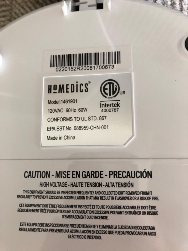 Breathe easier with the HoMedics TotalClean Deluxe air purifier, model 1461901. Designed for medium to large rooms, this unit combines True HEPA filtration, UV-C light, and an ionizer to capture allergens, germs, and odors. It also features a built-in essential oil tray, night-light, and auto mode with particle sensor for intelligent air quality management. A sleek tower design makes it ideal for bedrooms, offices, or shared living spaces. Brand: HoMedics Model: 1461901 (TotalClean Deluxe) Dimensions: Approx. 10" W × 25" H Features: True HEPA filter UV-C light for germicidal purification Ionizer with on/off control Auto mode with particle sensor Night-light and timer Essential oil tray Child lock
