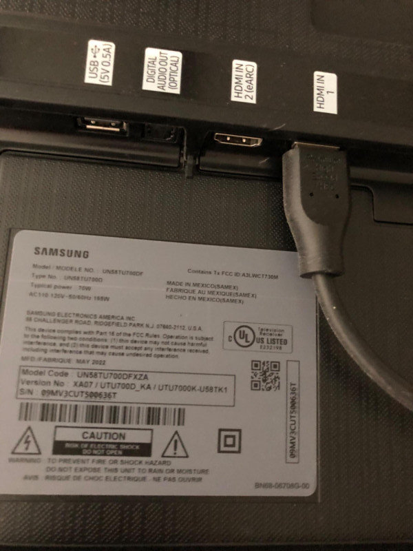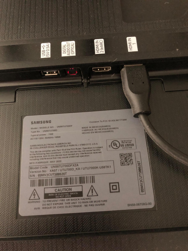A solid upgrade for any breakroom, home setup, or shop lounge. This Samsung 58" Crystal UHD Smart TV (Model UN58TU700DFXZA) delivers sharp 4K resolution, HDR support, and smart features powered by Tizen OS. With built-in Wi-Fi, Bluetooth, and compatibility with Alexa and Google Assistant, it’s ready for streaming, casting, or quick setup. Includes remote and wall mount hardware for easy install—just bring a drill and a level. Whether you're winding down after a job or setting up a clean media station, this unit gets it done with no fuss. Buyer removes wall mount at pickup. Bring appropriate tools.