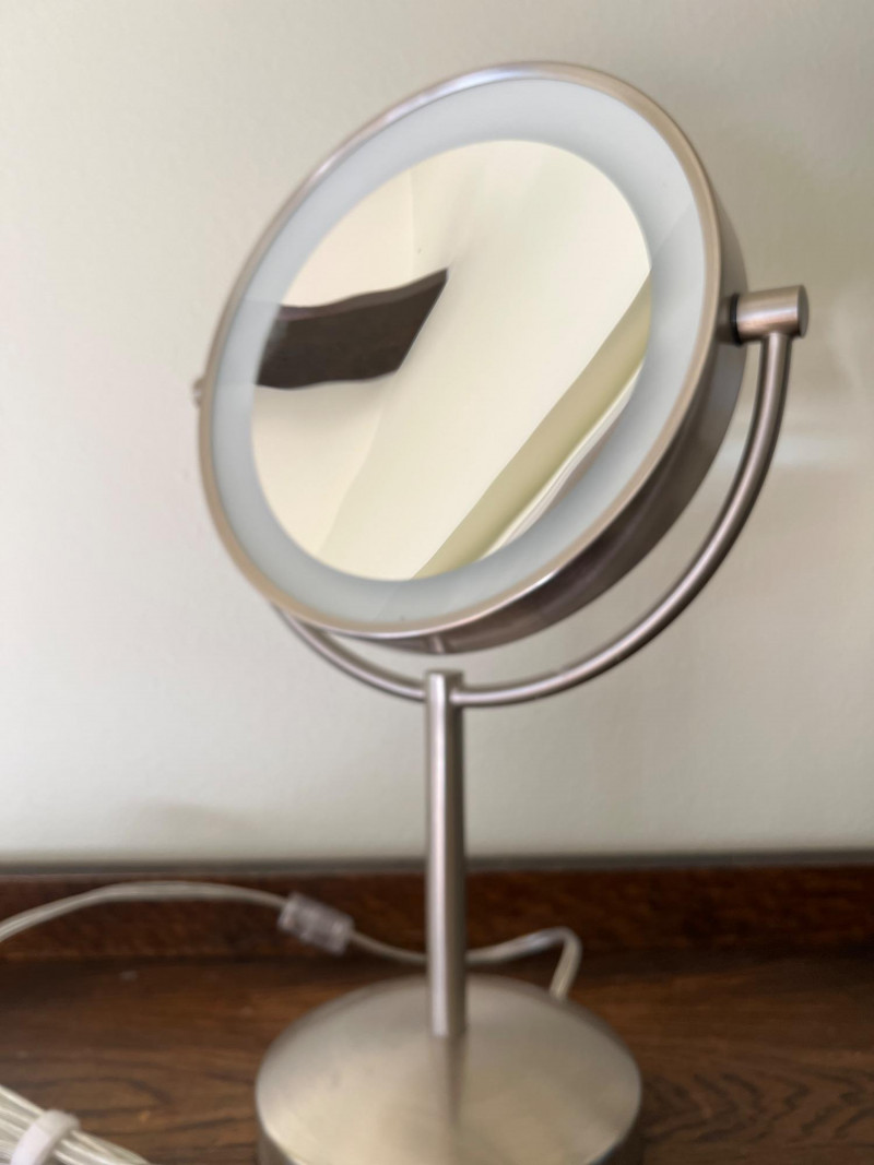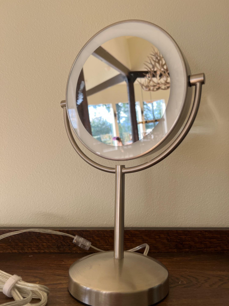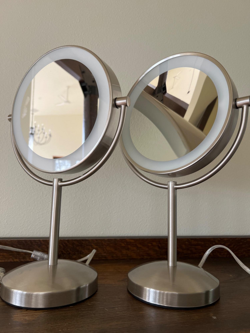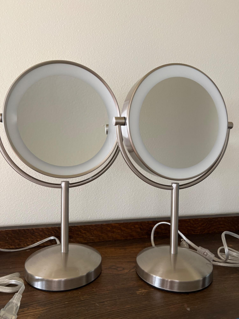 A matching pair of Conair BE21GDH lighted vanity mirrors in satin nickel finish. Each mirror features a double-sided oval design with 1x and 7x magnification, energy-efficient LED lighting, and a sleek, modern silhouette. Ideal for grooming, makeup, or detail work, these corded mirrors offer both elegance and utility. Light wear consistent with use.