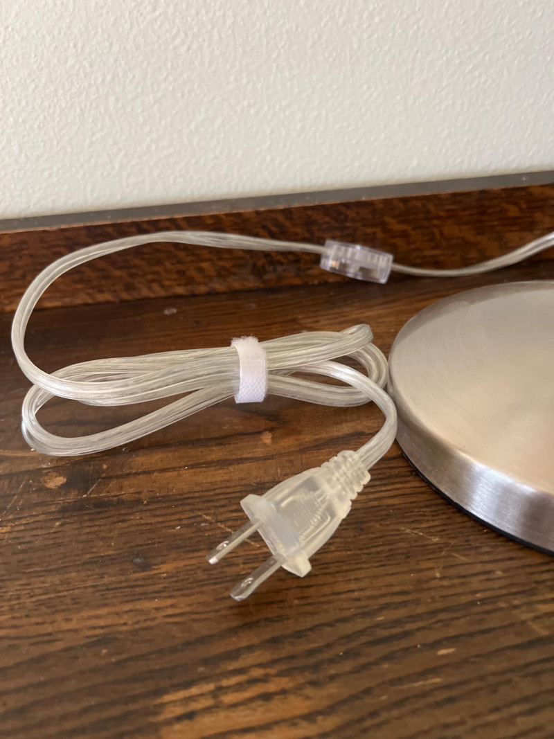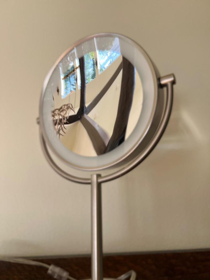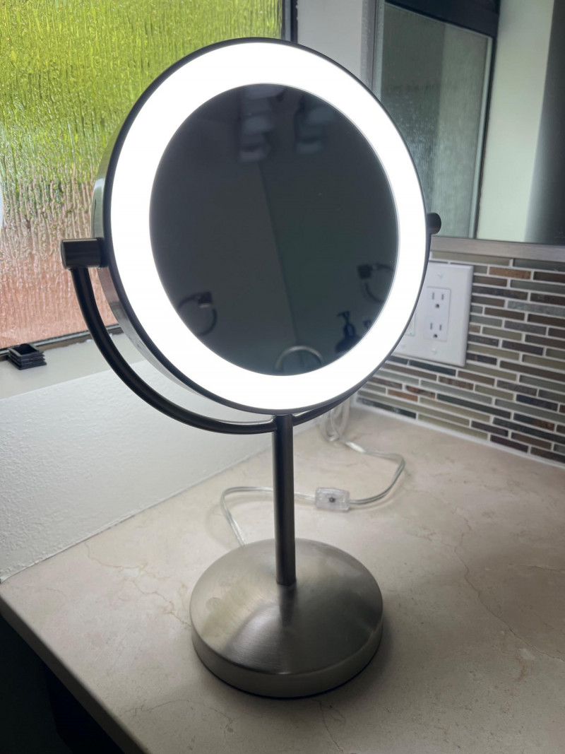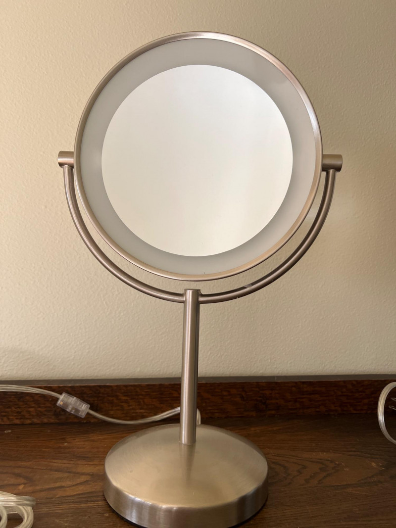 A matching pair of Conair BE21GDH lighted vanity mirrors in satin nickel finish. Each mirror features a double-sided oval design with 1x and 7x magnification, energy-efficient LED lighting, and a sleek, modern silhouette. Ideal for grooming, makeup, or detail work, these corded mirrors offer both elegance and utility. Light wear consistent with use.