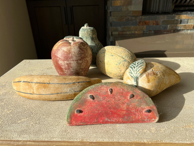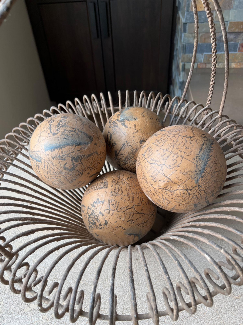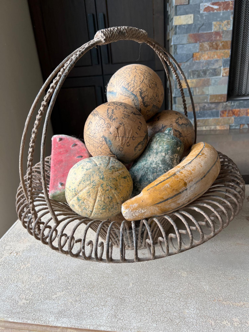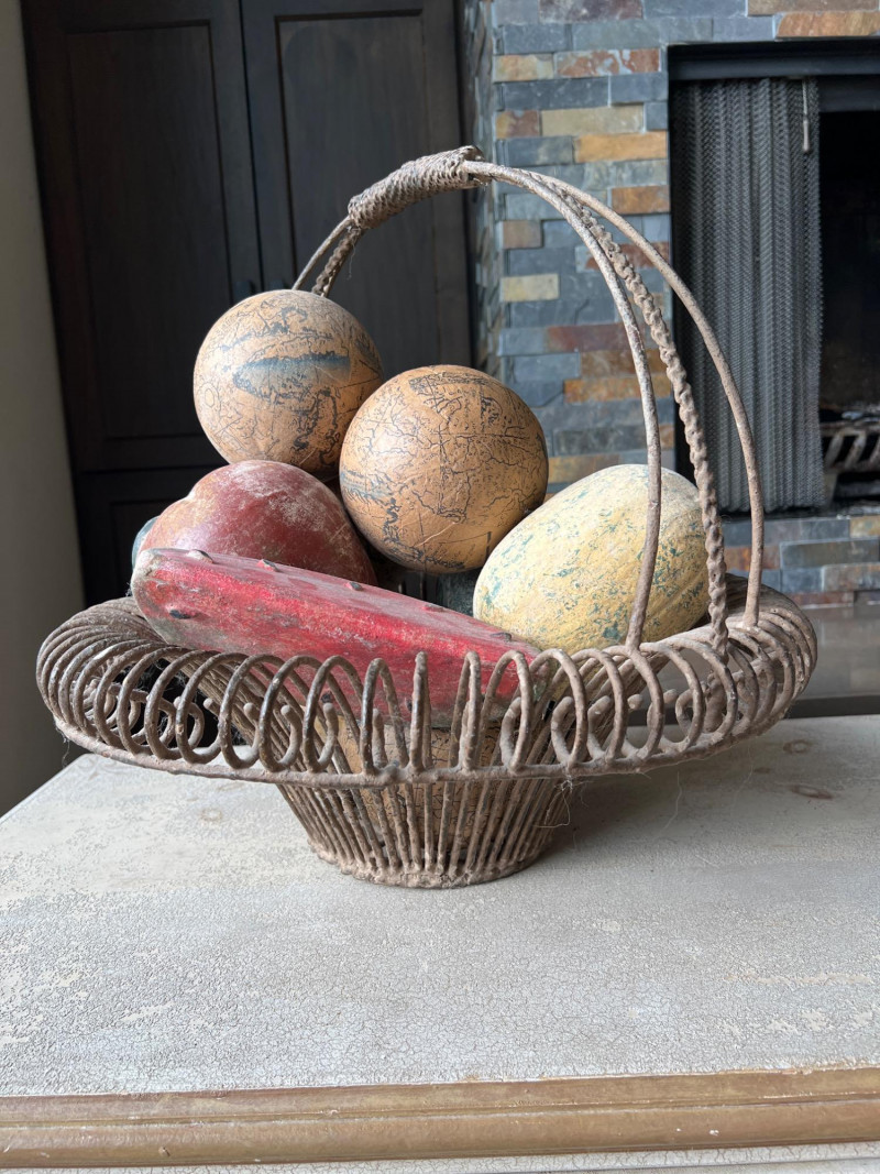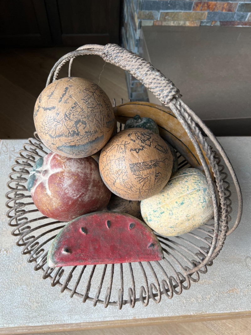 A rustic centerpiece that blends weight, whimsy, and heritage. This twisted wrought iron basket cradles a collection of hand-painted ceramic fruits—each piece substantial in feel and rich in color. Nestled among them are four vintage-style paper mâché sphere balls, evoking Old World artistry with marbled finishes and muted tones. Ideal for farmhouse kitchens, seasonal displays, or collector vignettes that celebrate texture and tradition. Fruit lengths range from 8" to 11" length and 6" width