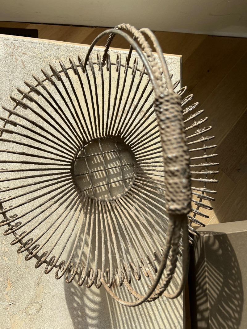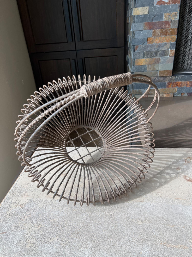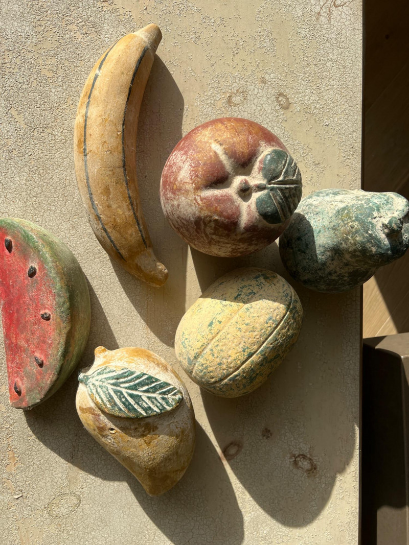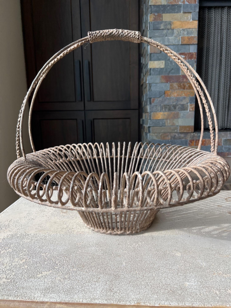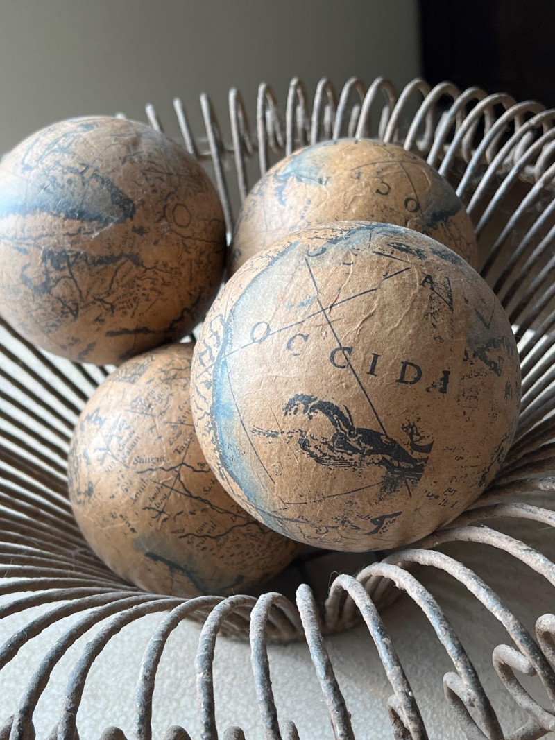 A rustic centerpiece that blends weight, whimsy, and heritage. This twisted wrought iron basket cradles a collection of hand-painted ceramic fruits—each piece substantial in feel and rich in color. Nestled among them are four vintage-style paper mâché sphere balls, evoking Old World artistry with marbled finishes and muted tones. Ideal for farmhouse kitchens, seasonal displays, or collector vignettes that celebrate texture and tradition. Fruit lengths range from 8" to 11" length and 6" width
