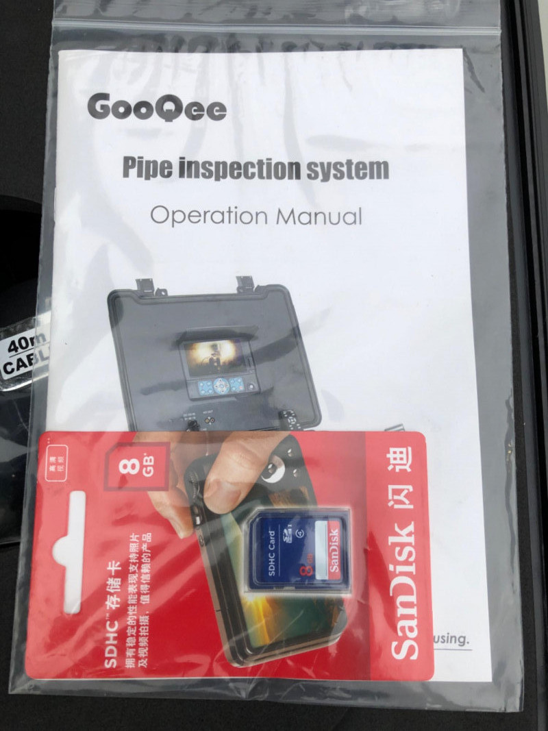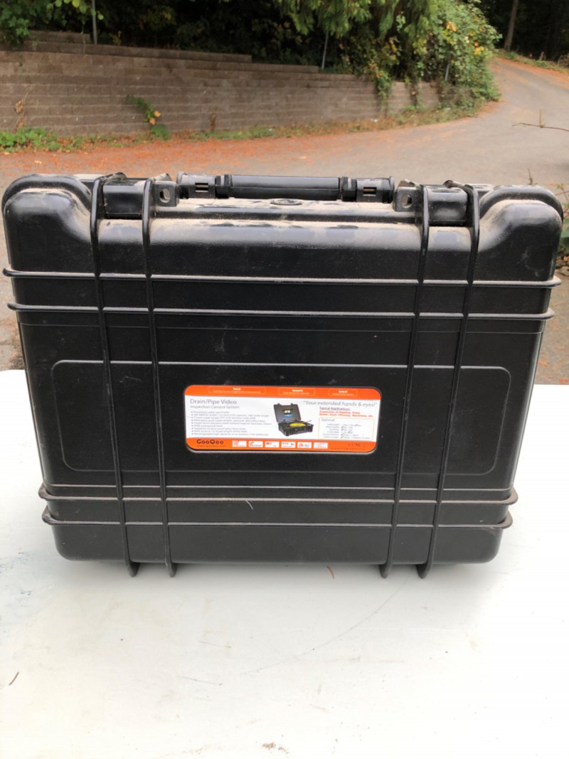 Professional-grade pipe inspection system by GooQee. Includes a waterproof camera with sapphire lens cover, fiberglass push cable, and built-in DVR with distance counter. Designed for inspecting sewer and drain lines, with self-leveling camera head and on-screen text writer. Appears to be unused.