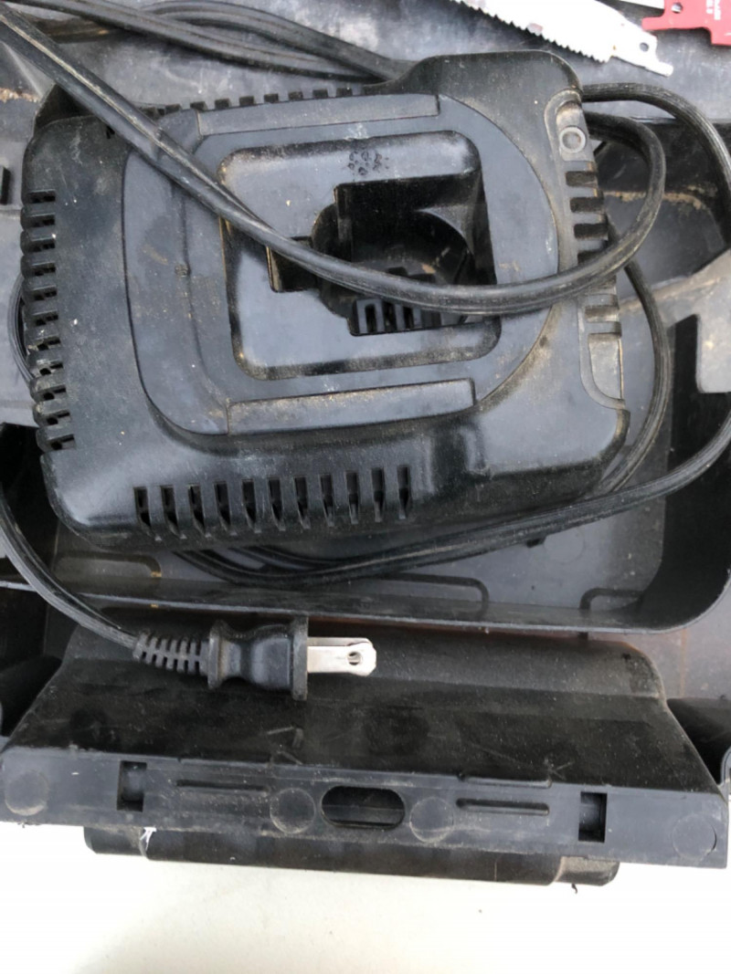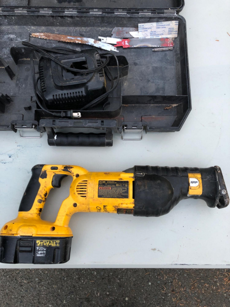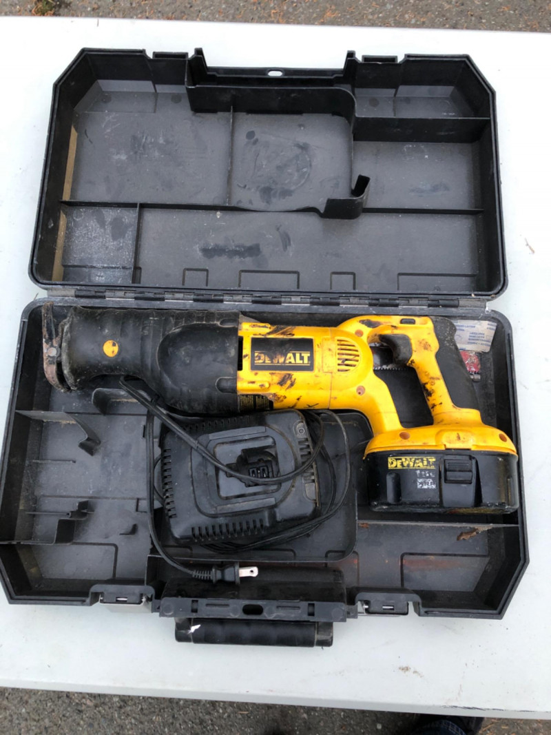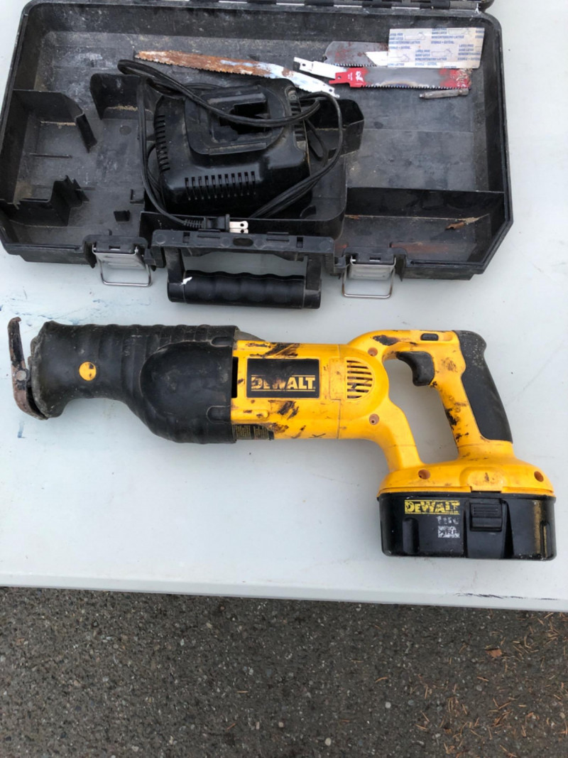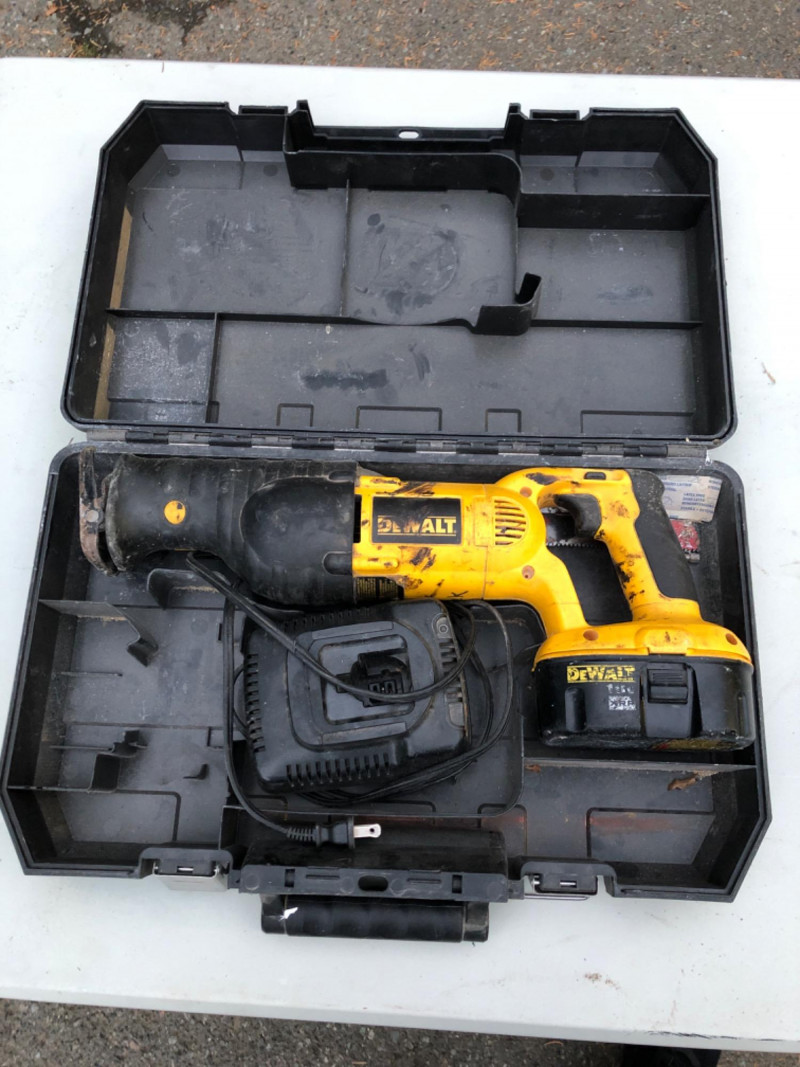 DeWalt DC385 cordless reciprocating saw in working condition. Features variable speed trigger, keyless blade clamp, and pivoting shoe for controlled cuts in wood, metal, and demolition materials. Powered by 18V battery (included along with charger) this saw is known for durability and versatility in tight spaces. Ideal for contractors, remodelers, and restoration crews needing portable cutting power. Included: