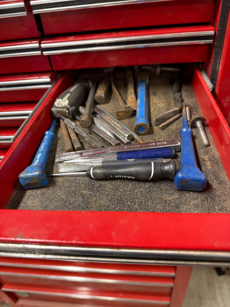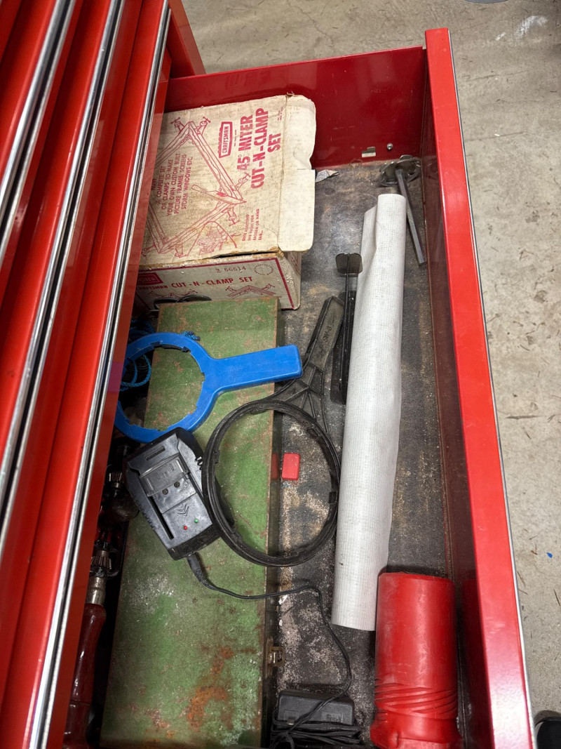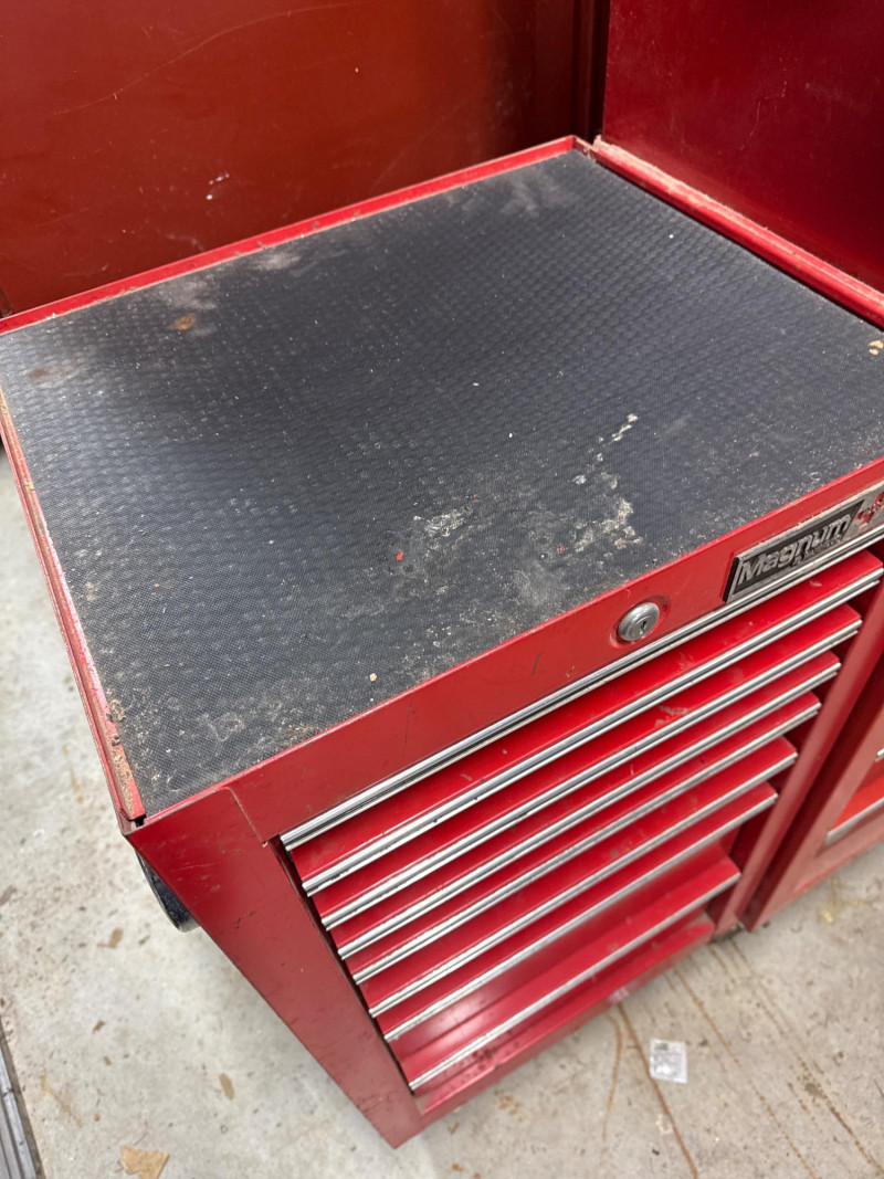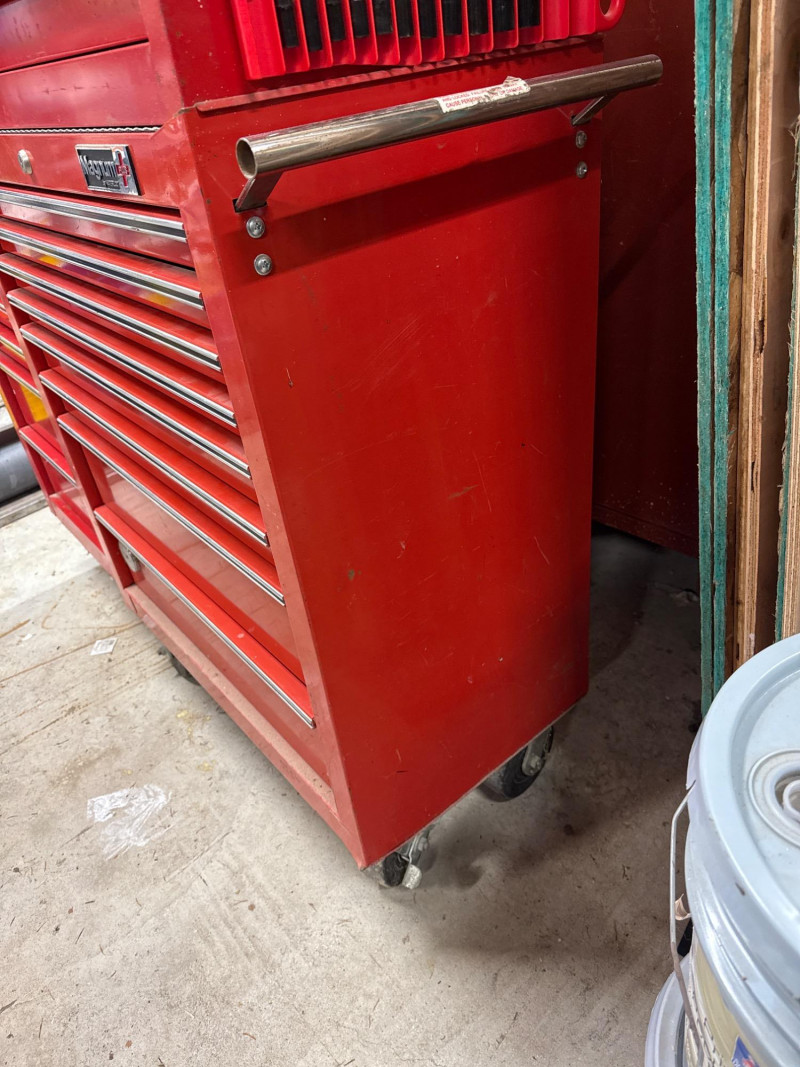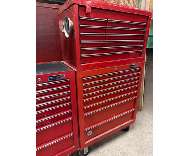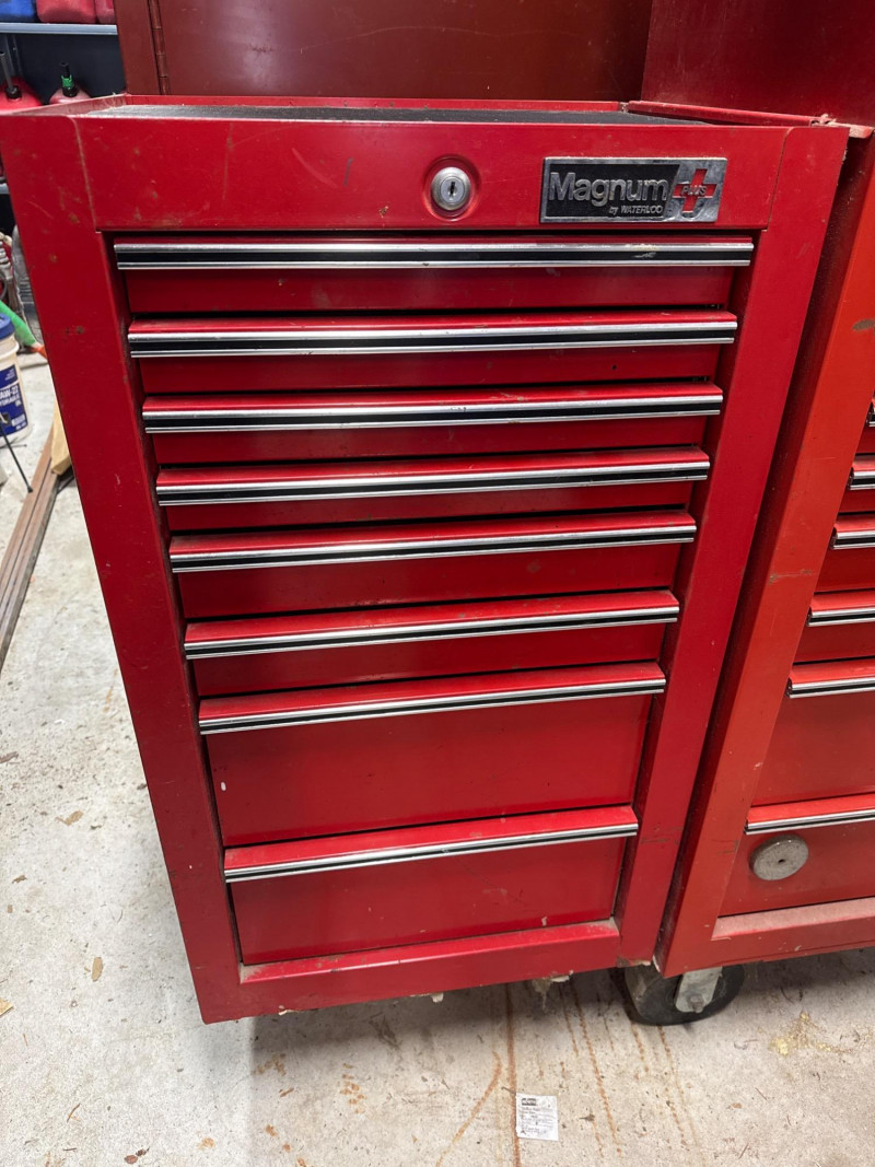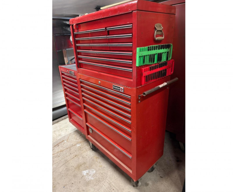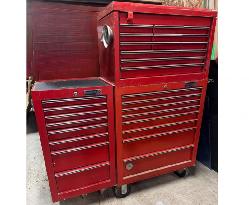 Magnum tool chest with matching extension, fully stocked with a wide variety of hand tools. This multi-drawer setup offers organized access to wrenches, pliers, screwdrivers, fasteners, measuring tools, and more. It's a ready-to-roll solution for any startup contractor, handyman, or shop owner looking to build out their tool inventory. The chest itself is built for durability, with ball-bearing drawer slides, locking mechanisms, and a powder-coated finish. The extension adds vertical storage and easy access to frequently used gear. Brand: Magnum Type: Tool chest with extension Contents: Assorted hand tools Use: Contractor, handyman, shop setup Condition: Usable Dimensions: Larger unit - 33" W x 18" D x 46" T Side extension unit - 21" W x 18" D x 43" T Includes all tools that have been photographed in each drawer. Unit is on casters.