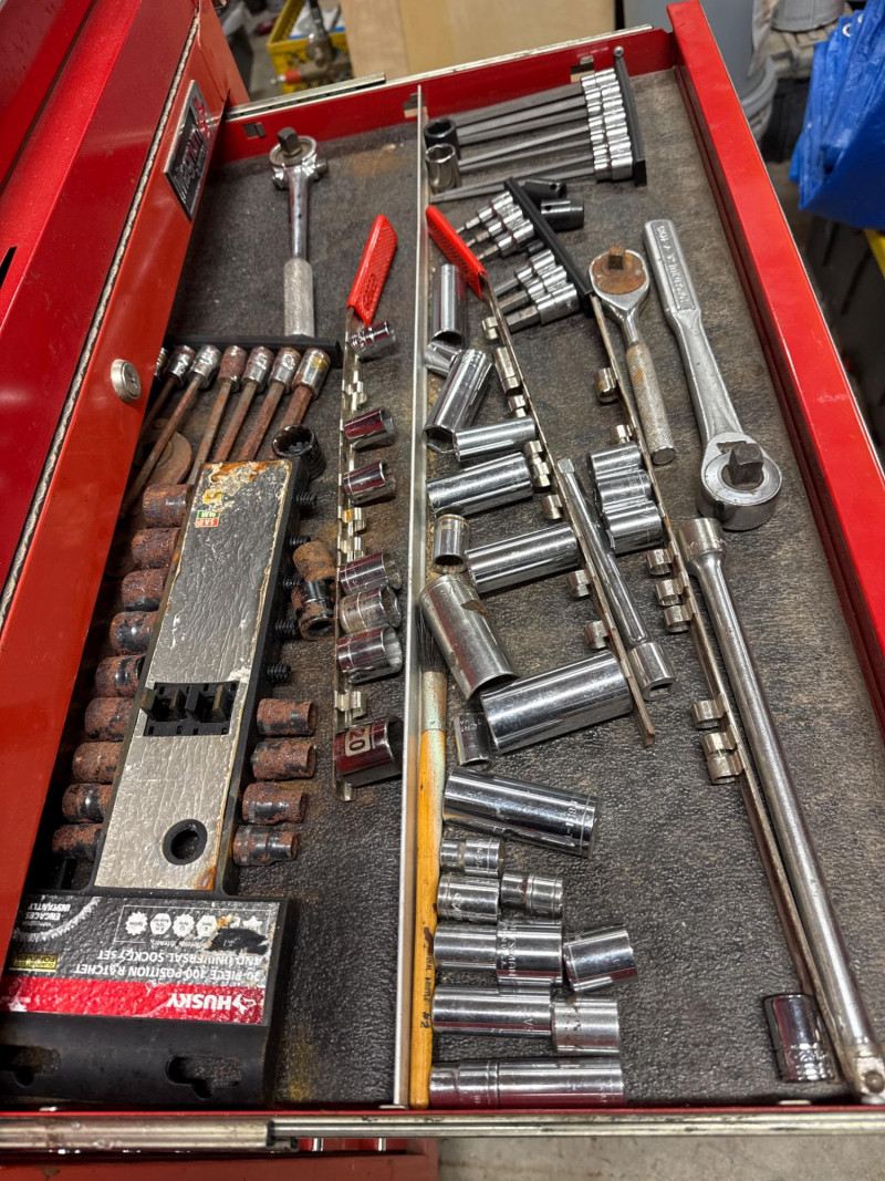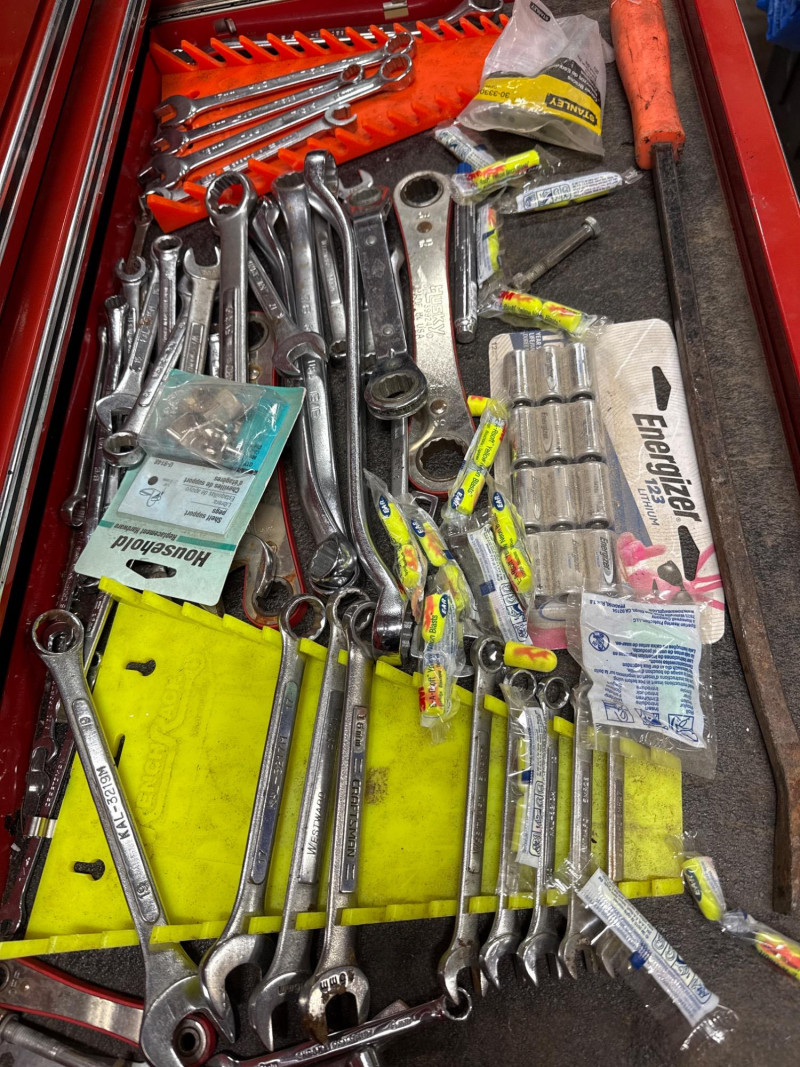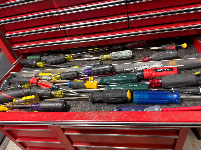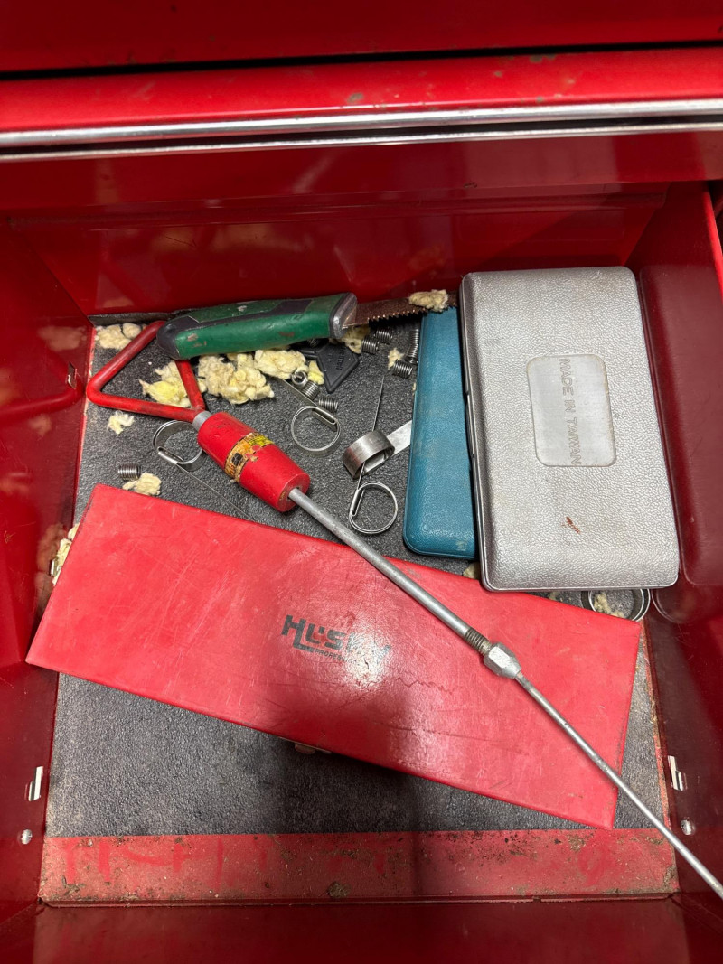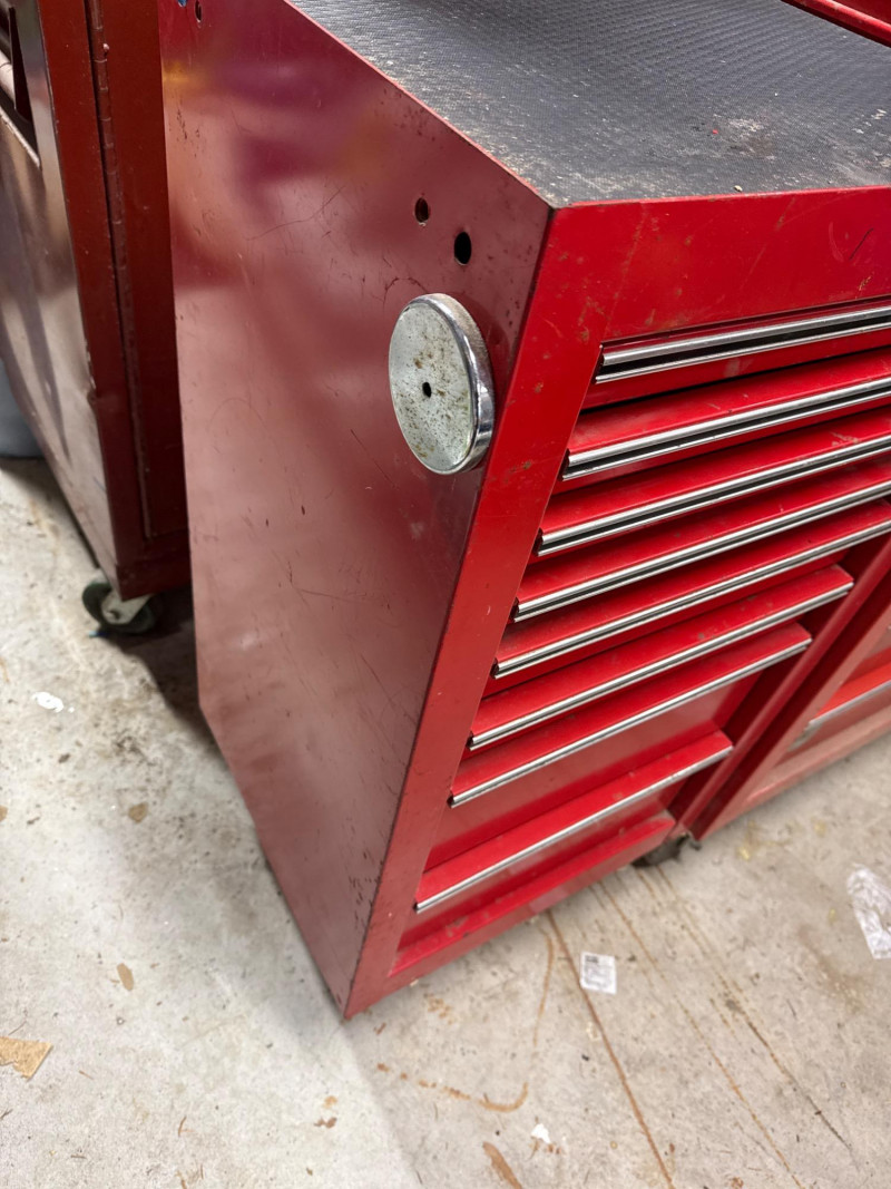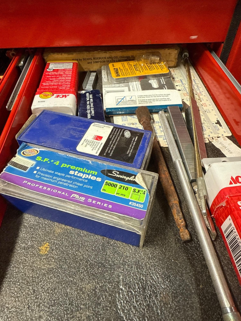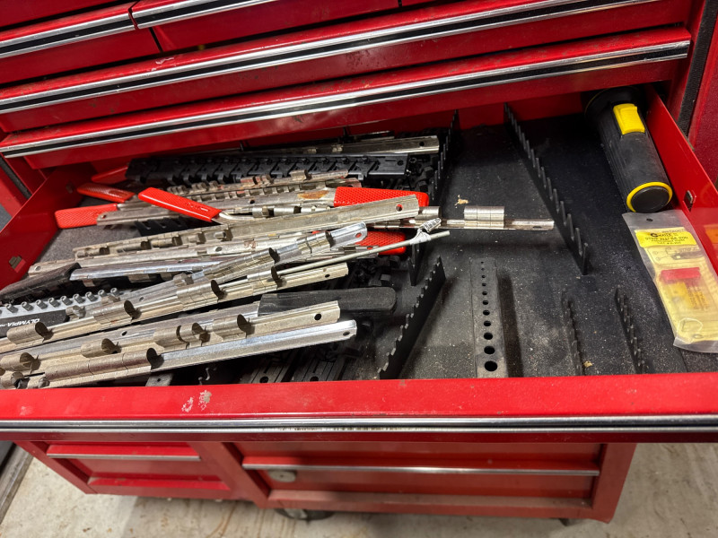 Magnum tool chest with matching extension, fully stocked with a wide variety of hand tools. This multi-drawer setup offers organized access to wrenches, pliers, screwdrivers, fasteners, measuring tools, and more. It's a ready-to-roll solution for any startup contractor, handyman, or shop owner looking to build out their tool inventory. The chest itself is built for durability, with ball-bearing drawer slides, locking mechanisms, and a powder-coated finish. The extension adds vertical storage and easy access to frequently used gear. Brand: Magnum Type: Tool chest with extension Contents: Assorted hand tools Use: Contractor, handyman, shop setup Condition: Usable Dimensions: Larger unit - 33" W x 18" D x 46" T Side extension unit - 21" W x 18" D x 43" T Includes all tools that have been photographed in each drawer. Unit is on casters.