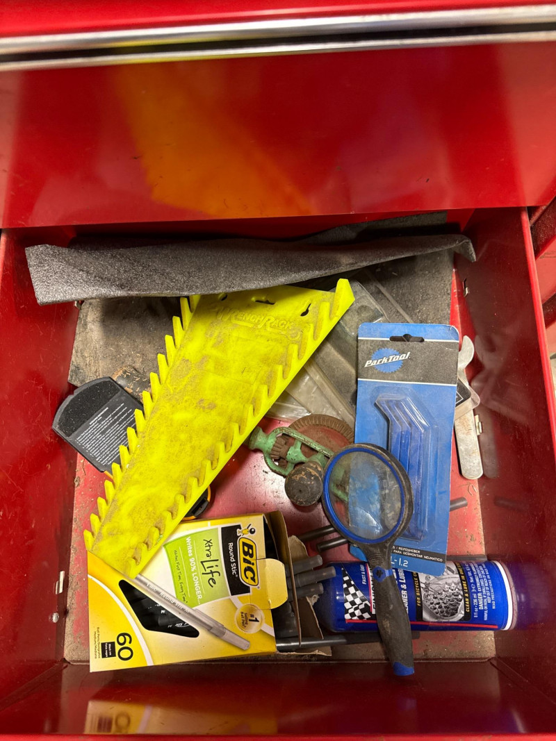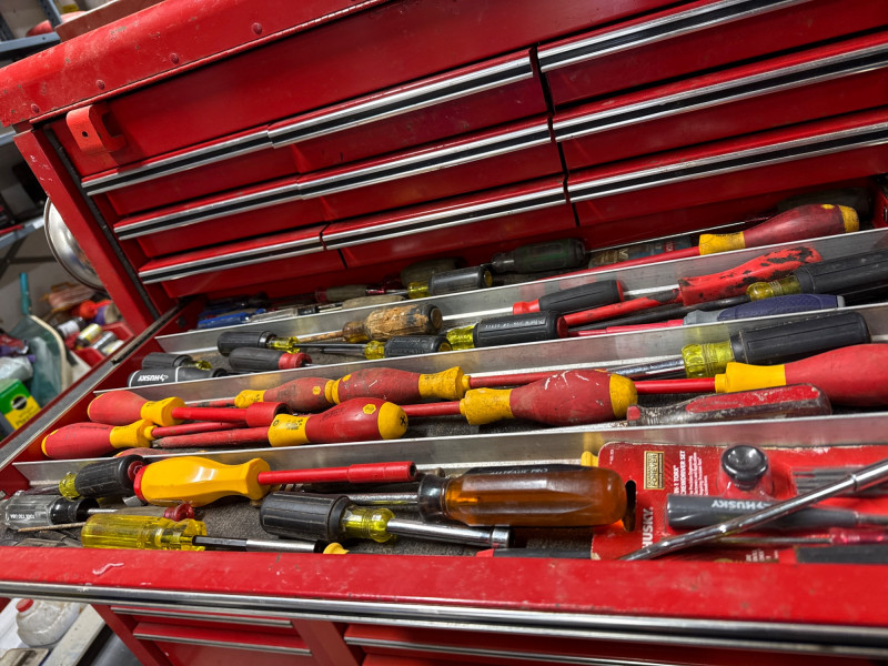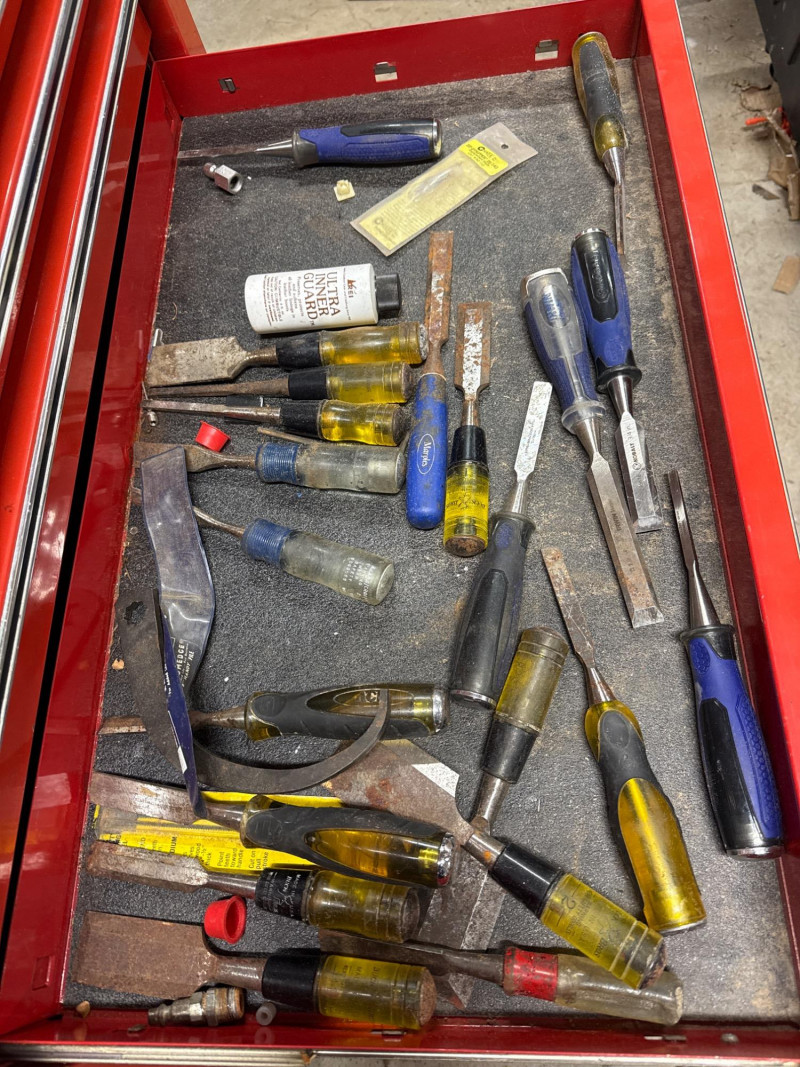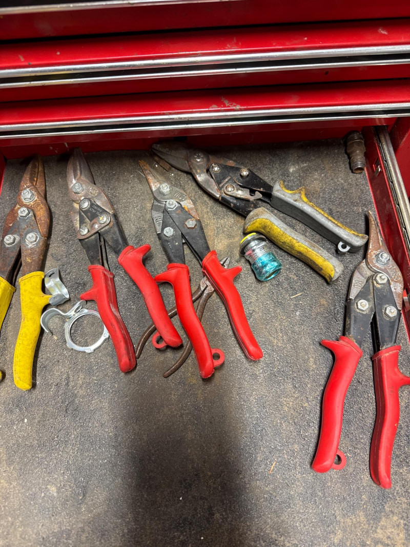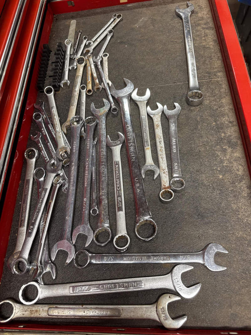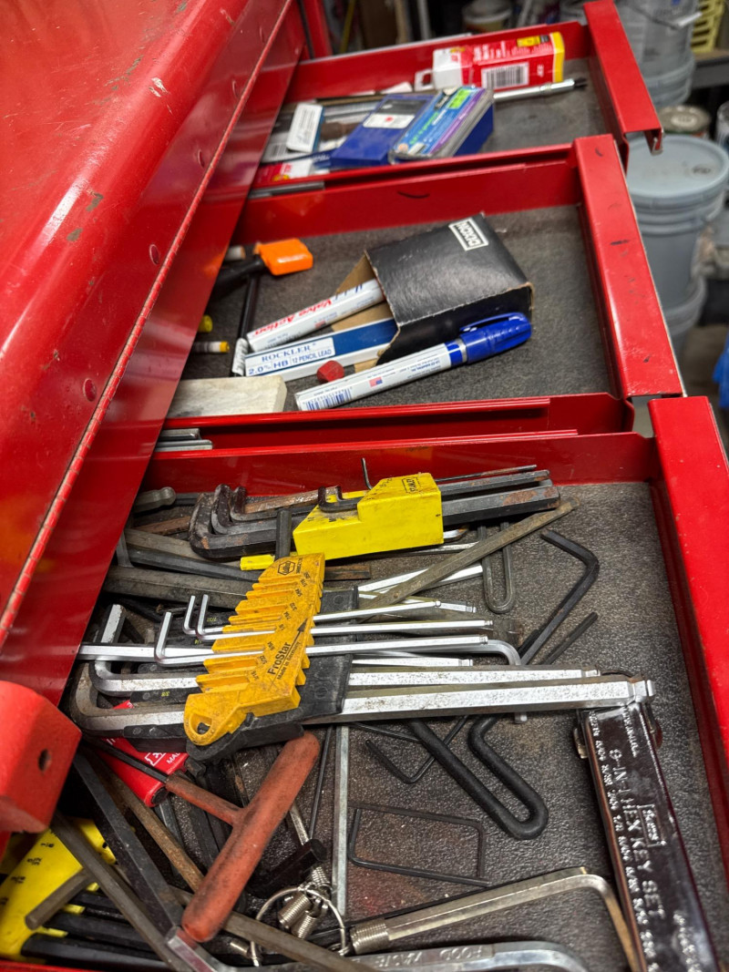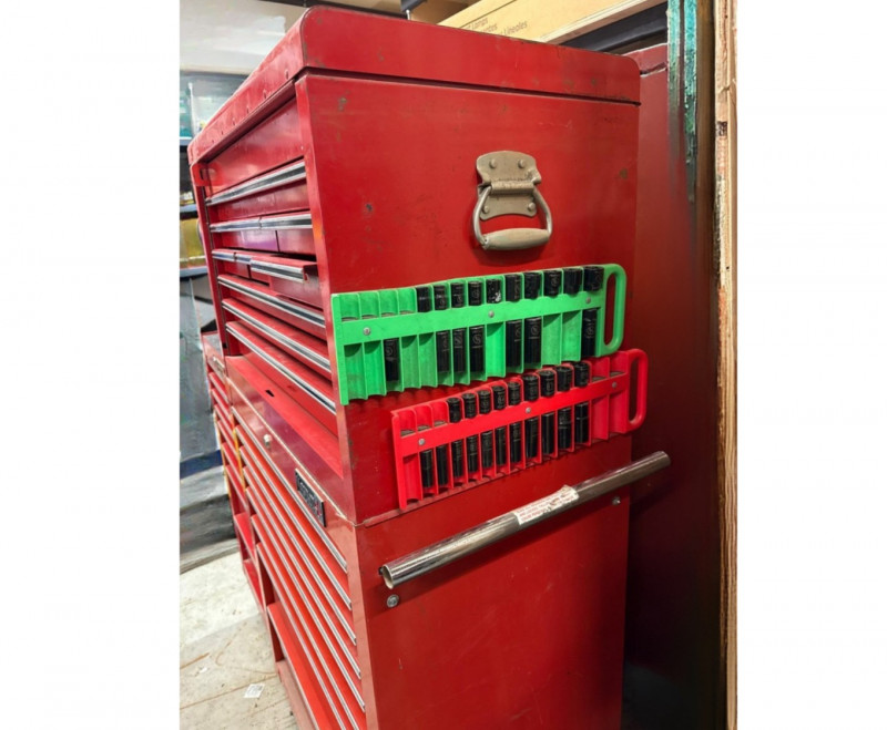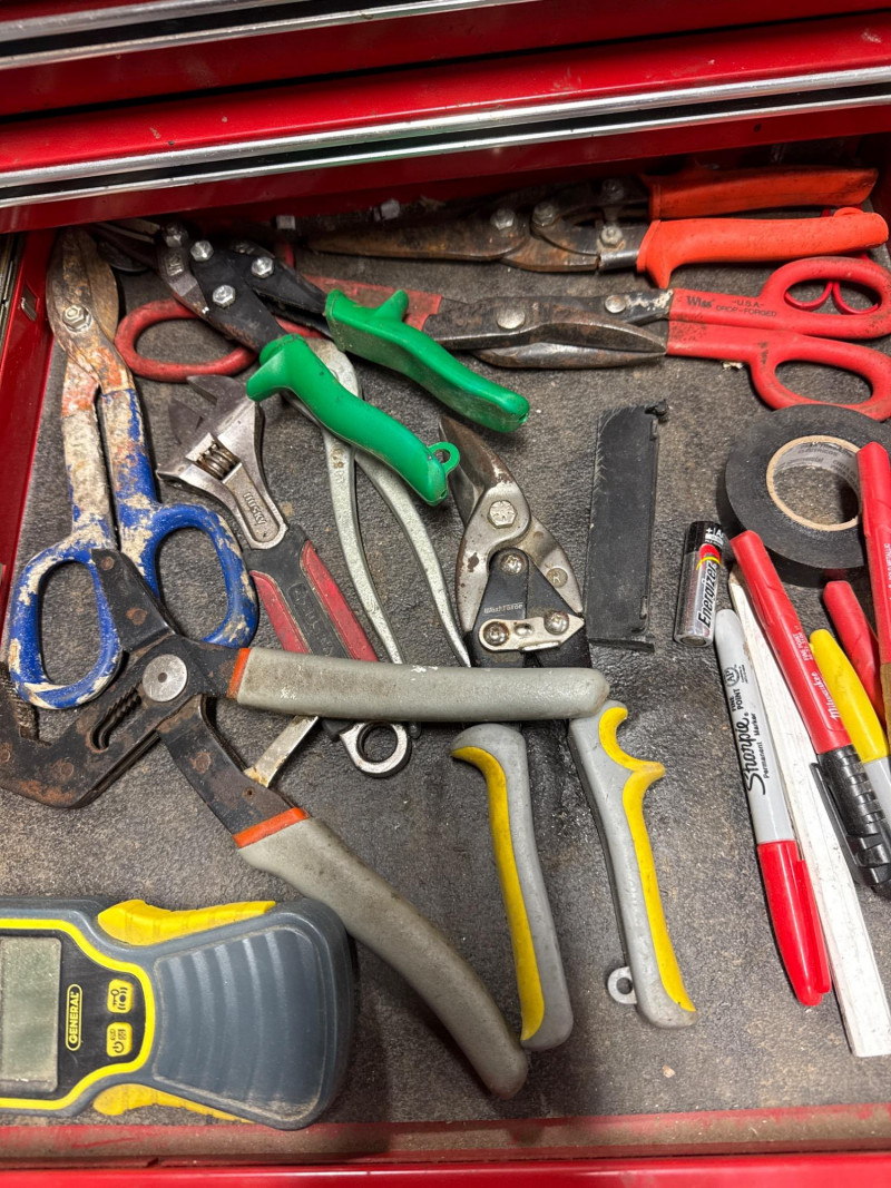 Magnum tool chest with matching extension, fully stocked with a wide variety of hand tools. This multi-drawer setup offers organized access to wrenches, pliers, screwdrivers, fasteners, measuring tools, and more. It's a ready-to-roll solution for any startup contractor, handyman, or shop owner looking to build out their tool inventory. The chest itself is built for durability, with ball-bearing drawer slides, locking mechanisms, and a powder-coated finish. The extension adds vertical storage and easy access to frequently used gear. Brand: Magnum Type: Tool chest with extension Contents: Assorted hand tools Use: Contractor, handyman, shop setup Condition: Usable Dimensions: Larger unit - 33" W x 18" D x 46" T Side extension unit - 21" W x 18" D x 43" T Includes all tools that have been photographed in each drawer. Unit is on casters.