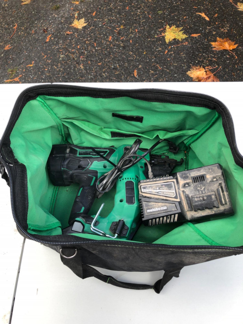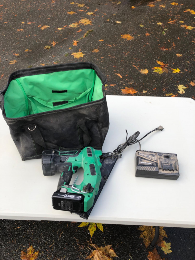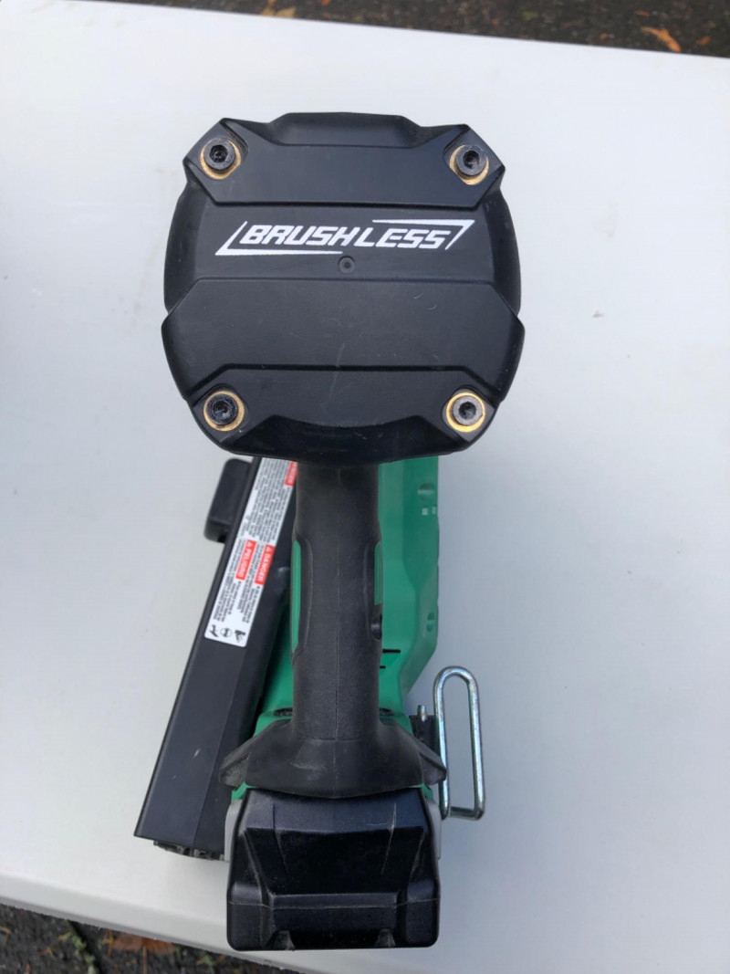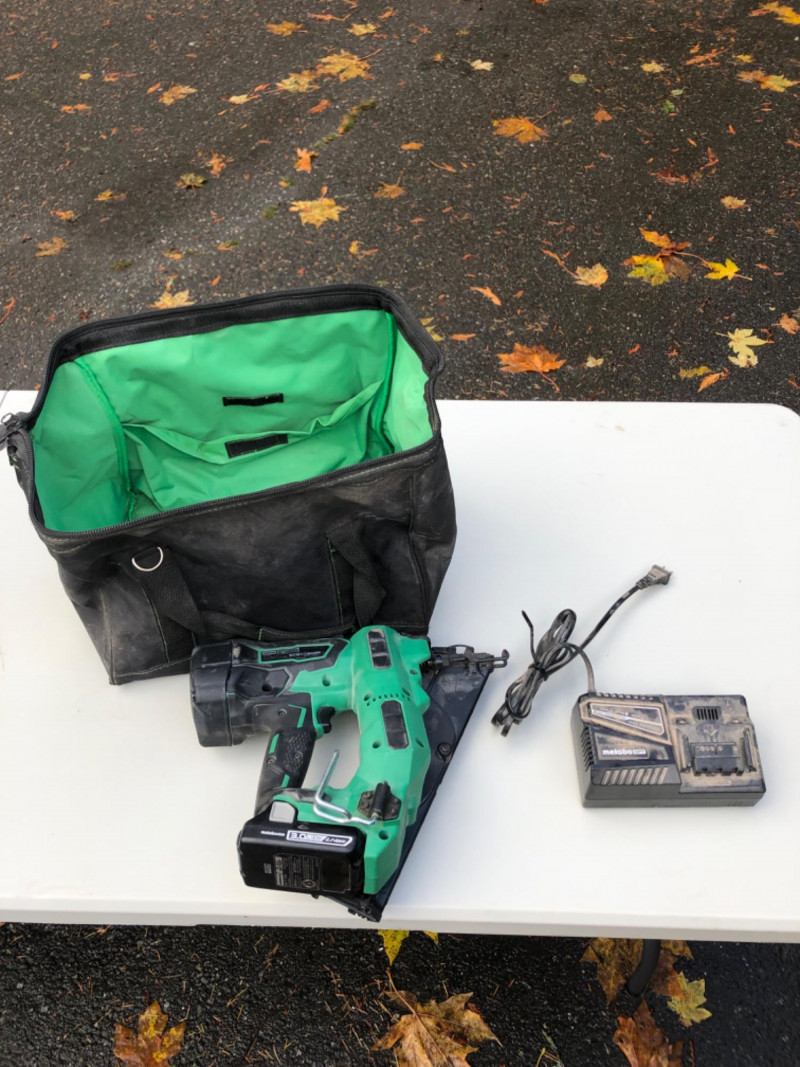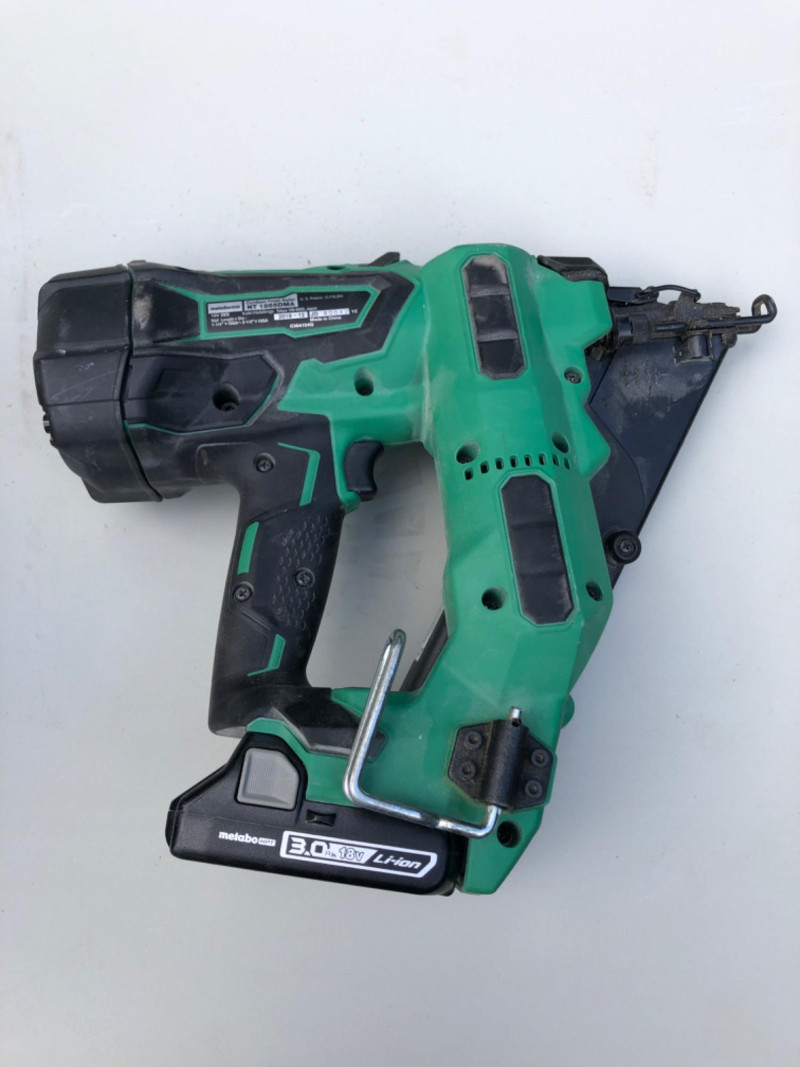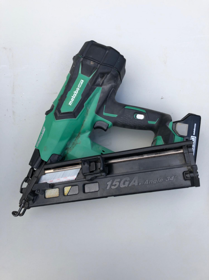 Metabo HPT cordless 15-gauge angled finish nailer in working condition. Includes battery, charger, and carrying case. Designed for precision trim work, cabinetry, and finish carpentry, this tool offers tool-free depth adjustment, dry-fire lockout, and brushless motor efficiency. Lightweight and maneuverable with angled magazine for tight corners. A reliable choice for contractors and restoration crews.