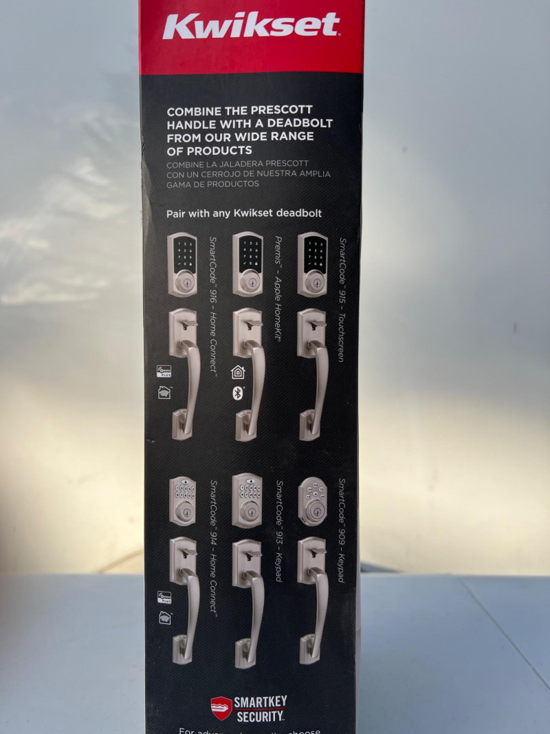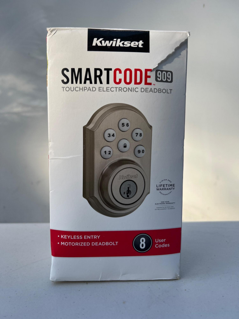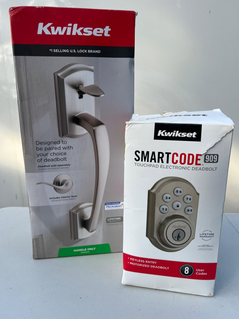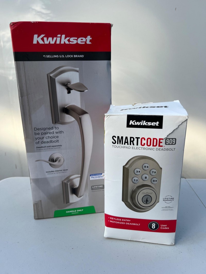 Kwikset handle and SmartCode deadbolt. In working condition. This set offers keyless entry with programmable codes, ideal for residential or light commercial use. The SmartCode deadbolt features a backlit keypad and motorized locking mechanism, while the matching handle adds a clean, modern finish. A practical upgrade for entry doors, blending convenience, security, and style. SmartCode lock has been rekeyed. Both items are in box. The handle appears to be never removed from box, the lock is not guaranteed to be never used.