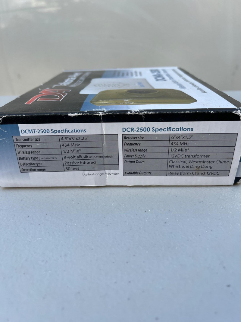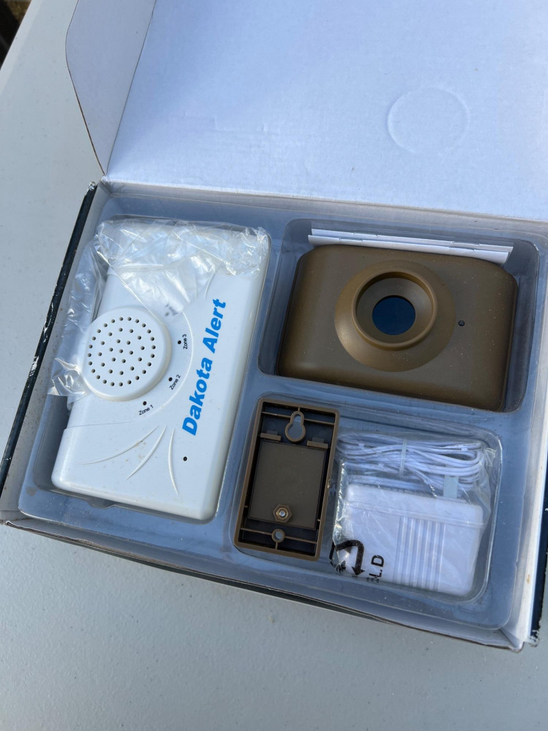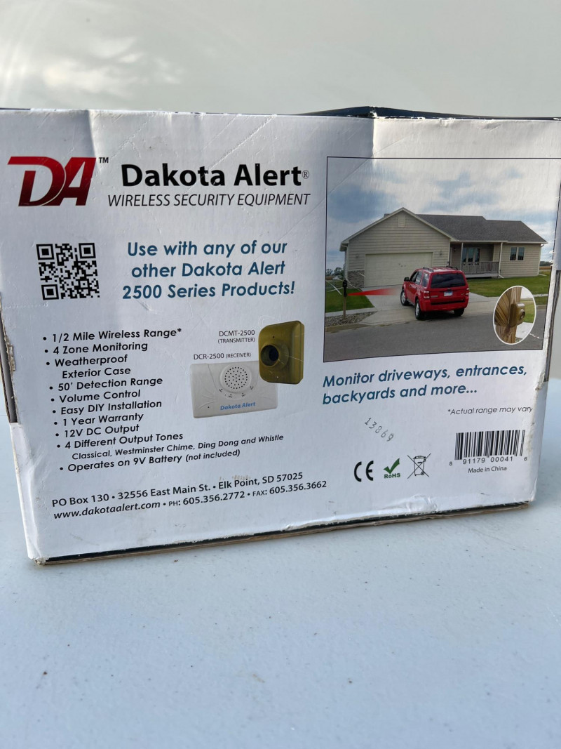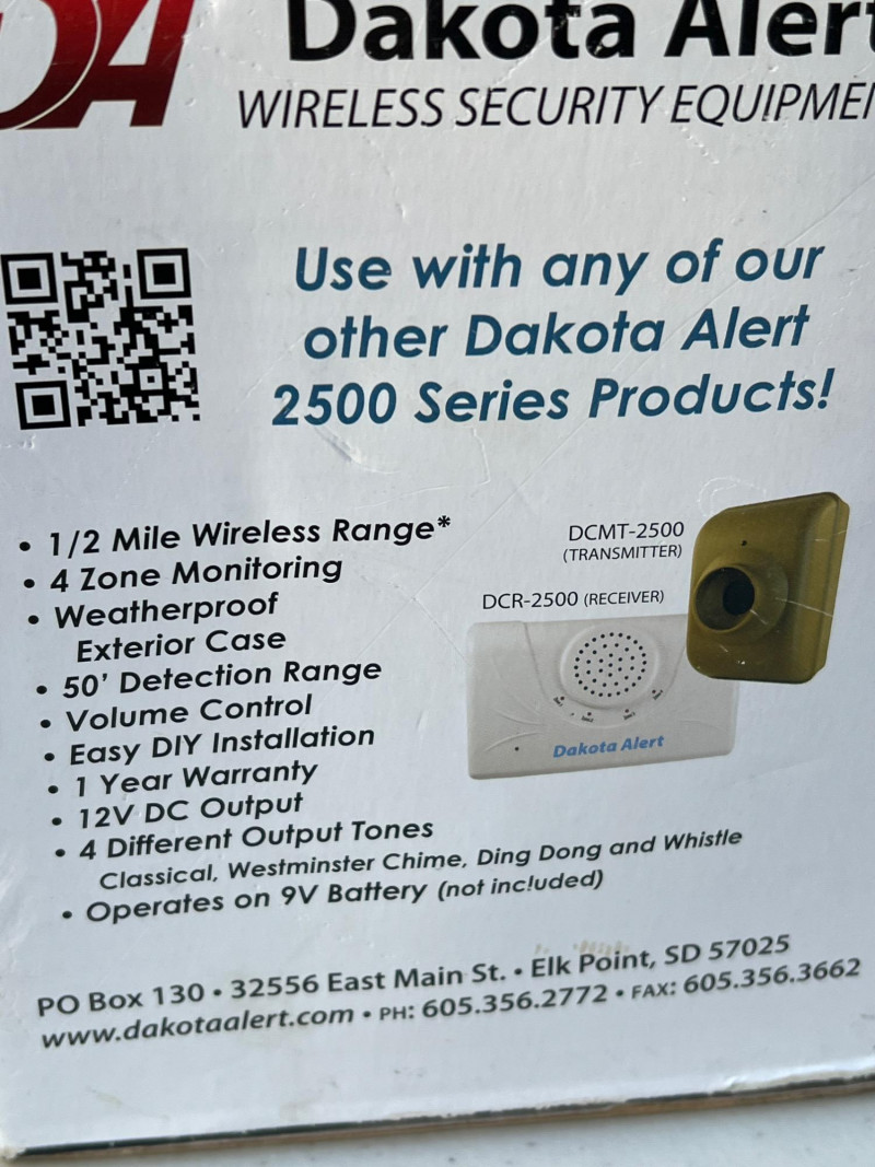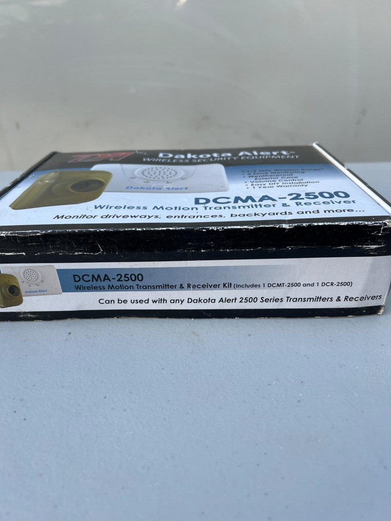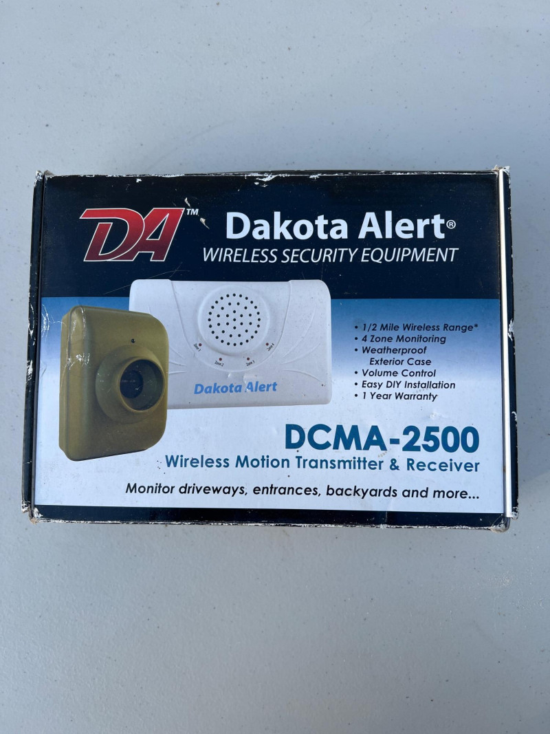 New-in-box Dakota Alert DCMA-2500 wireless motion alert system. This kit features a motion-detecting sensor and receiver designed to monitor driveways, entrances, or remote zones. The sensor detects movement (vehicles or people) up to 50 feet away and transmits alerts wirelessly to the receiver up to ½ mile away. Ideal for residential, farm, or light commercial use, the system offers reliable perimeter awareness with simple installation and expandable components. Model: DCMA-2500 Includes: Motion sensor + receiver Range: Up to ½ mile wireless transmission Detection Distance: Up to 50 feet Power: Sensor uses one 9V battery (not included); receiver plugs into standard outlet Condition: New in box