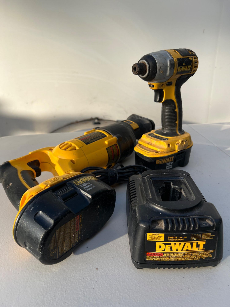 Two DeWalt cordless hand tools. In working condition. Includes a ¼" impact driver and a compact drill/driver—ideal for framing, cabinetry, or shop use. Lightweight and battery-powered for mobility and precision. A trusted set for contractors or DIYers. Included: