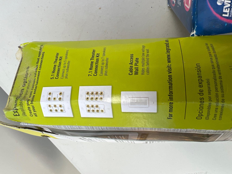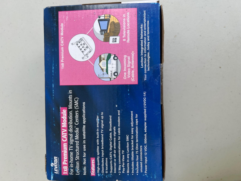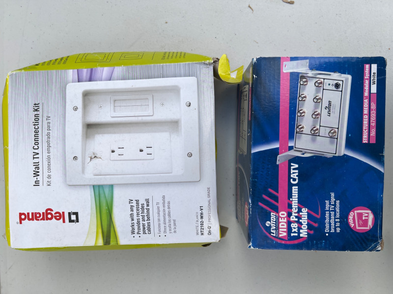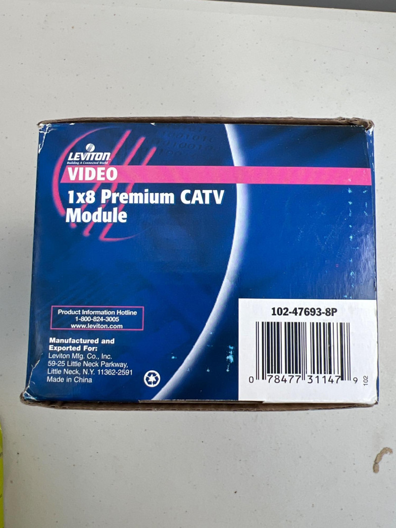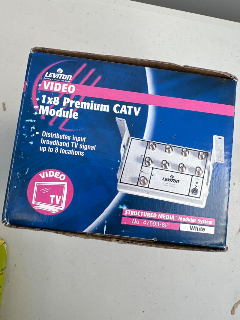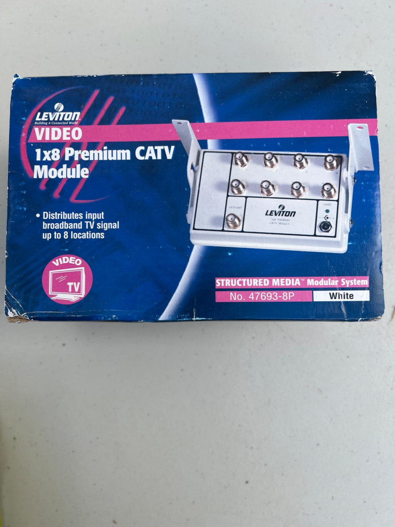TV outlet and CATV module for broadband signal distribution still in original boxes and packaging. Designed for structured wiring systems, this set supports cable TV and data routing in residential or light commercial setups. A practical component for AV installers or tech upgrades.