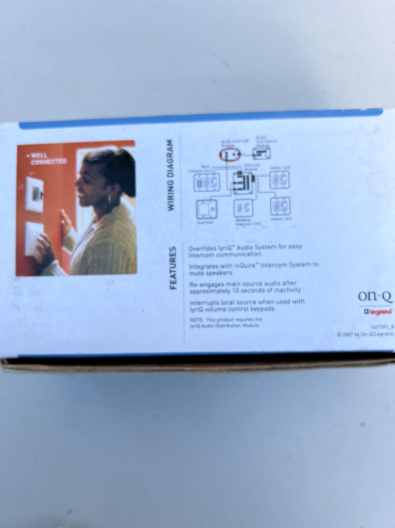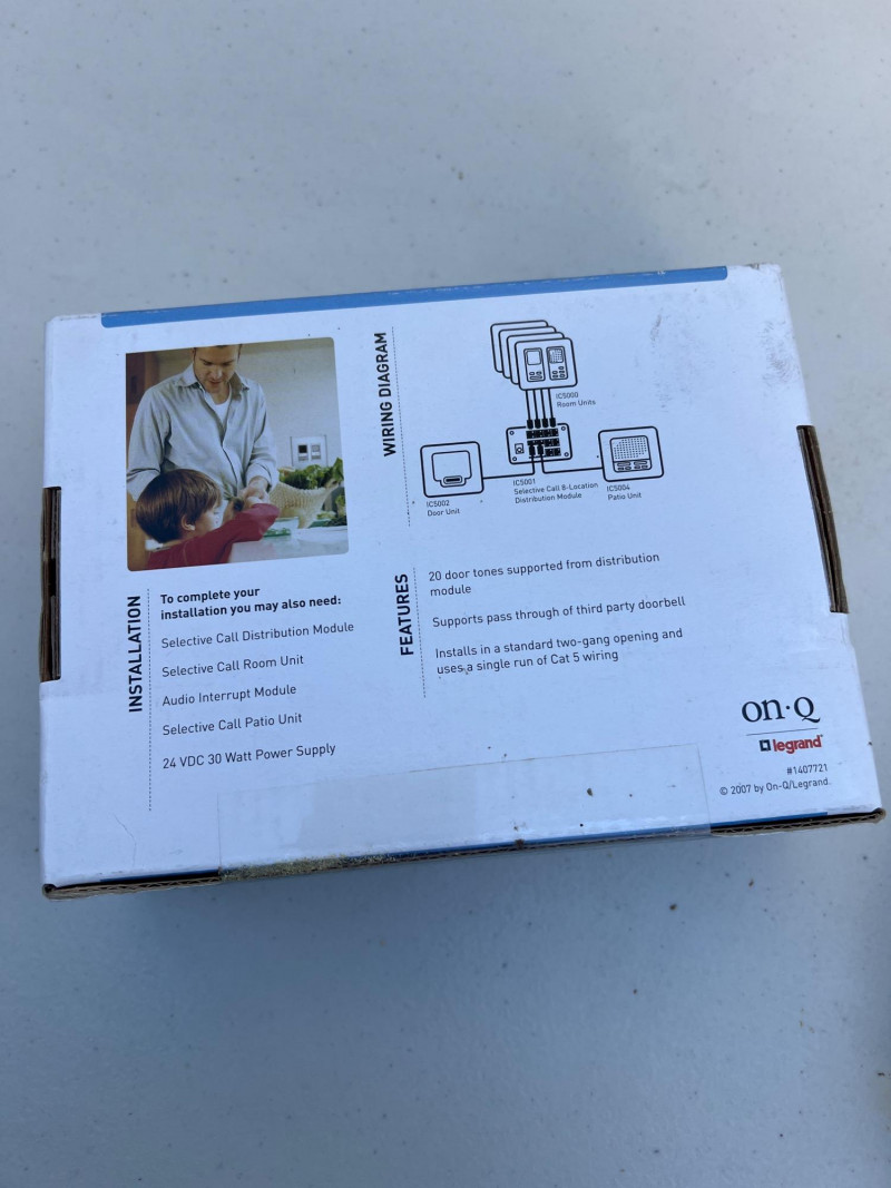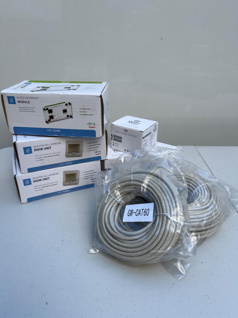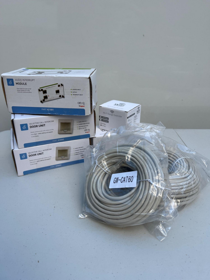 bundled set of home communication and networking components—ideal for smart home upgrades, contractor installations, or tech-savvy DIYers. This lot includes: (1) Legrand On-Q Audio Interrupt Module– Integrates with On-Q systems to prioritize audio sources (e.g., doorbell chimes or paging) (2) Legrand On-Q Selective Call Intercom Door Units– Weather-resistant exterior stations for two-way communication at entry points (1) 100' CAT5 Cable + (1) 60' CAT5 Cable– For structured wiring and device connectivity (3) Wi-Fi Extenders– Brand unspecified; ideal for boosting signal coverage in larger homes or offices This is a versatile lot for expanding intercom functionality, improving network reach, or stocking up on structured wiring essentials.