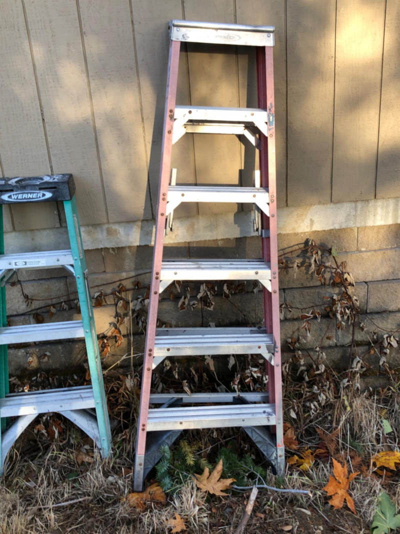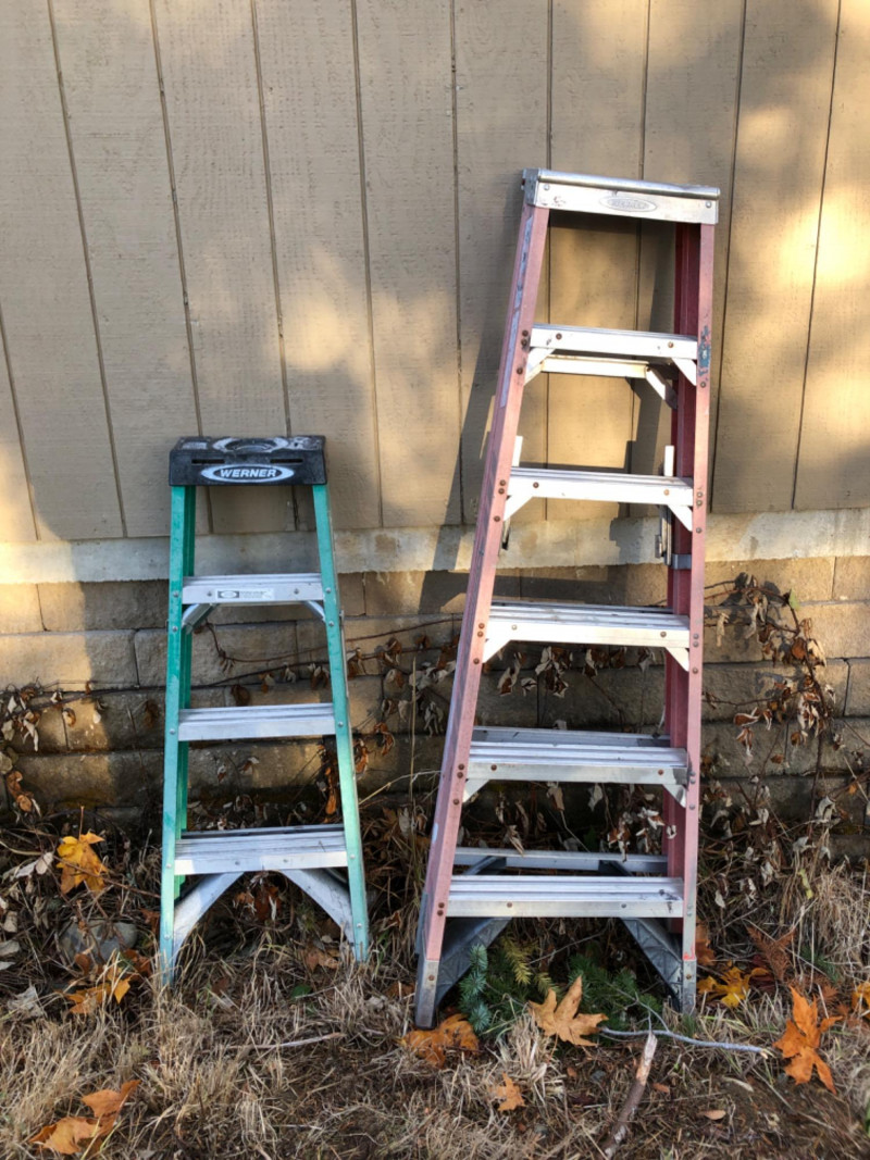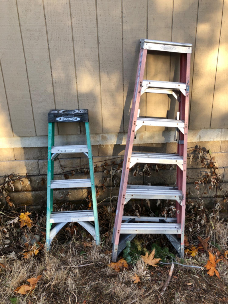 Two A-frame work ladders, one 4-foot and one 6-foot. Ideal for painting, maintenance, or light construction tasks. Compact and easy to store.